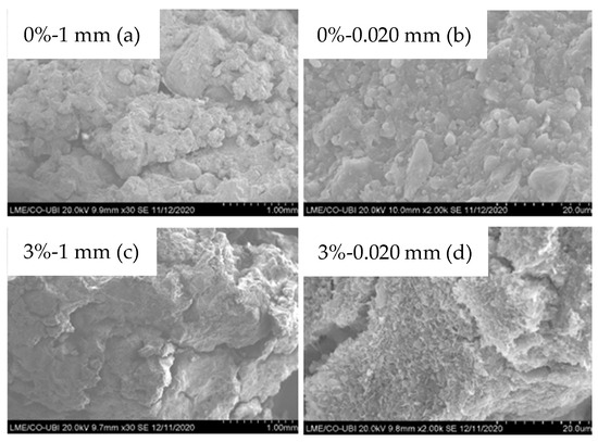 The SEM examinations of both natural as well as stabilized soil are presented in Figure 12. It demonstrates that they are dissimilar in their microstructure morphology. At lower magnification (Figure 12a), untreated soil shows a group of agglomerates of different configurations and sizes, from a few hundred microns to a millimeter. A few numbers of macrospores (inter-aggregate) pores are observed between the agglomerates, resulting from compaction [66]. At a higher magnification (Figure 12b), a tidy association is clearly visible between clay and quartz particles; clay particles form a film that covers the sand grains and connects them tightly. Pores around 0.020 mm can be observed.