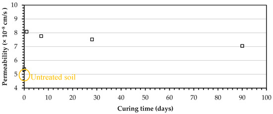 The hydraulic conductivity was measured for untreated and cement-stabilized soil. As is shown in Figure 3d, the test process employed was the falling-head method as outlined by Bowles (1978) and the ASTM D2434 standard [55,56]. The permeability coefficient will be determined from the linear segment of the curve using Equation (1) corrected by Equation (2):