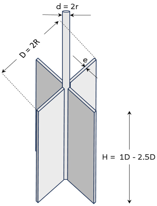 The internationally recognised reference standard for the vane shear test (VST) is ASTM D2573 [10]. However, in this study, the standard used for testing activities is INVIAS INV E-170 [11]. In an analysis of the two standards, it was concluded that they coincide in most aspects. Table 1 shows the different parameters considered, both in the probe and in the procedure, to ensure the test’s success. It is recommended that the vane height be 1 to 2.5 times the diameter D, which should be between 35 and 100 mm. The thickness of the vanes can fluctuate between 1.52 and 3.18 mm. At the same time, the vane shaft can have a diameter of 12.5 to 16.5 mm. These dimensions are detailed in Figure 1.