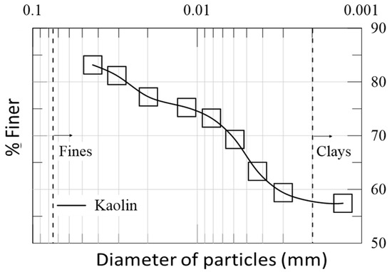 Regarding the index parameters of this material, it is a soil that is well-known in the local environment, where multiple investigations have been conducted using this type of clay. The liquid limit of kaolin is 52%, while the plasticity index is 19%. This parameter classifies the material as a high-plasticity silt according to the Unified Soil Classification System (USCS). For the fine fraction in the kaolin, a hydrometric analysis corroborates what was obtained in the plasticity chart, where a significant content of the material that passed the 200 sieve—particle size lower than 200 μm—was of silt size (Figure 5). The specific gravity of the material is 2.56.