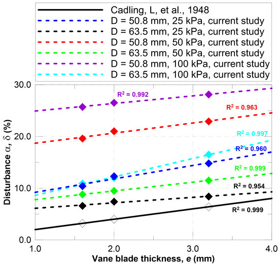 Initially, a correlation was observed that supports the hypothesis put forth by Cadling & Odenstad [7]. This conclusion indicates that greater vane blade thickness results in increased soil disturbance. Conversely, as the diameter of the vanes increases, the level of disturbance decreases, as illustrated in Figure 13. Notably, the theoretical disturbance (α) does not account for the variations in disturbance that depend on soil consolidation. This has been investigated in reconstituted clayey samples, providing relevant insights into the testing performance.
