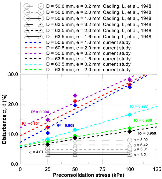 Cadling & Odenstad [7] studies do not report differences in disturbance as the preconsolidation stress in the sample changes. For this reason, the alternative degrees were graphed horizontally in Figure 13. One of the key contributions of the current study is its examination of the dependence of disturbance on the stress to which the material is subjected, a finding that holds significant implications for the field.