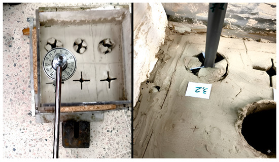 After inserting the vane for the disturbance analysis in the preconsolidated specimens, it was decided to complement the test information by applying the torque on the specimens for each vane, thus measuring the moment exerted to bring them to failure (Figure 14). The degree of disturbance affecting the blades’ neighbouring zones and the area of influence around the vane, which may also affect the torque measured in the samples, may depend on the results when performing the VST. This effect of disturbance on the measurement of undrained shear strength was reported by [3,14,15,30,31].
