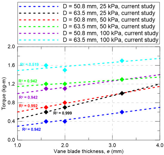 It is logical to expect that the relationship between torque and vane blade thickness will be examined, as previous studies have shown that disturbances can affect torque measurements and, consequently, the undrained shear strength. As illustrated in Figure 15, an increase in vane thickness, which represents the disturbance, correlates with an increase in torque. However, a comprehensive analysis should consider all factors involved in the investigation, including disturbance, torque, and preconsolidation stress.