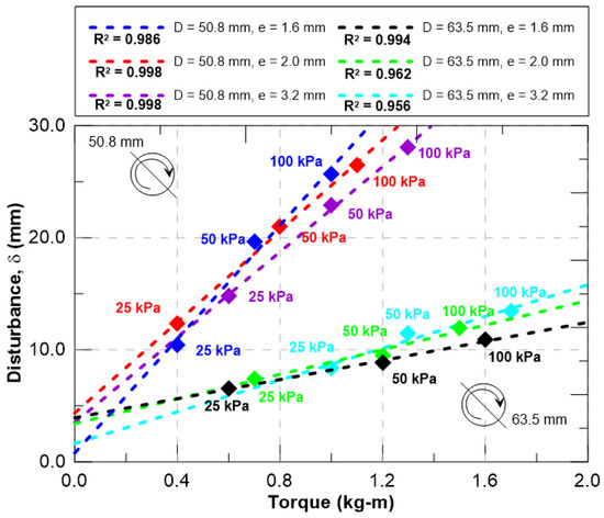 The tests were performed by manual methodology, following, in any case, the indications of [10]. Emphasis was placed on maintaining the rotational speed recommended by the reference standard. A torquemeter with an accuracy of +/− 1.0 kPa was used. The key focus of the research is to examine the relationship between torque and disturbance, while also considering two additional factors: the preconsolidation stress of the samples and the thickness of the blades. Figure 16 illustrates how disturbance varies as a function of torque. The results indicate a proportional increase in correlation between the two variables. Additionally, the increase in preconsolidation stress plays a significant role in this phenomenon. It was also observed that the smaller diameter vane, as expected, exhibits a lower response to torque.