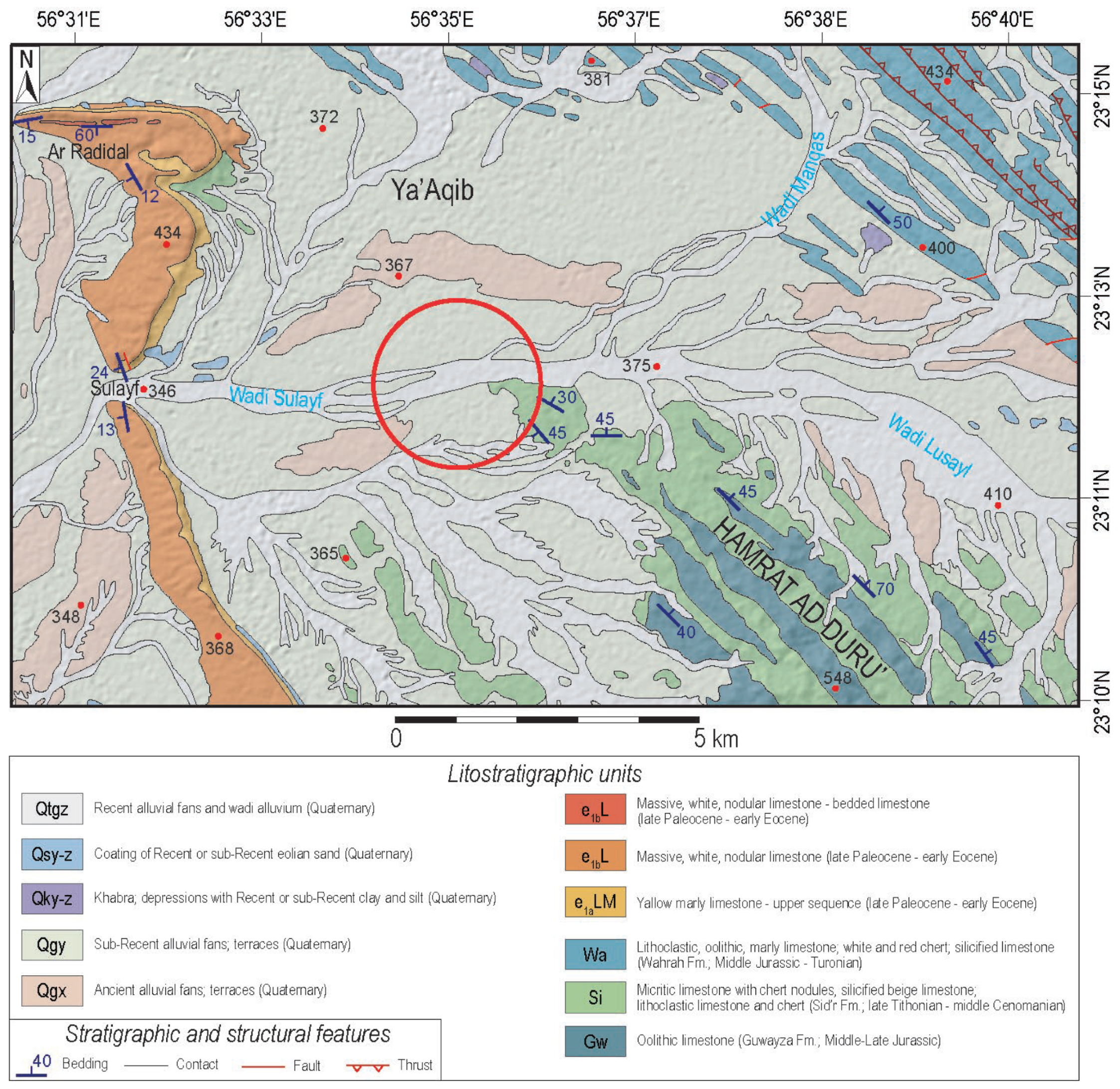 - Allochthonous units of the Hamrat Duru Group, belonging to the Hawasina Nappe. In particular, deposits belonging to three distinct formations are presents: (i) shallow-water packstone (Gw) of the Guwayza Fm., Middle–Upper Jurassic in age; (ii) open-marine deposits consisting of mudstone with chert nodules and turbiditic wackestone/packstone with cherts of the Sid’r Fm. (Si), late Tithonian to early–middle Cenomanian in age; (iii) open-shelf to distal open-marine deposits of the Wahrah Fm., represented by whachestone/packstone, mudstones and cherts, and cherts with silicified mudstones (Wa), Middle Jurassic to Turonian in age.
