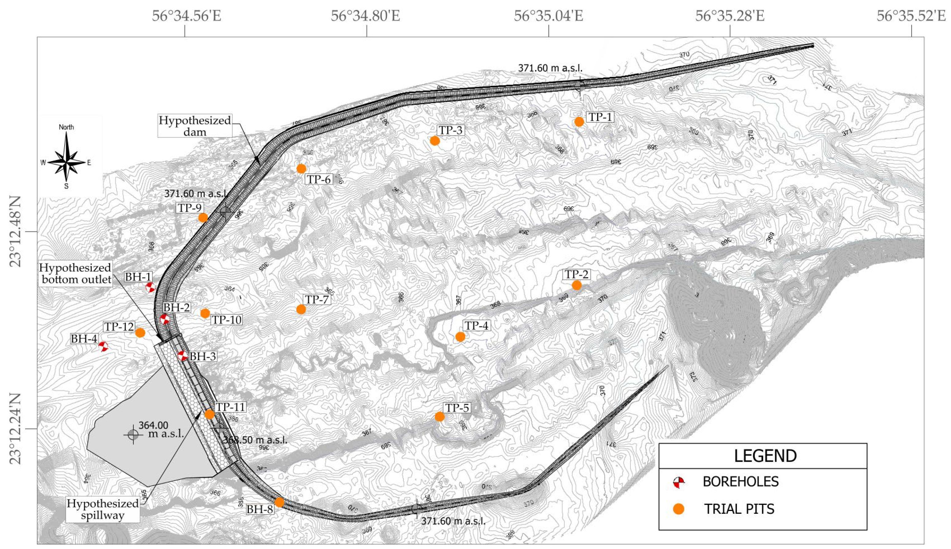 Canzoneri, V.; Bonfardeci, A.; Bongiovanni, S.; Coletta, L.; Curcuruto, E.P.; Gasparo Morticelli, M.; Sulli, A.; Canzoneri, A. Geological and Geotechnical Studies Aimed at the Project and Construction of Rockfill Recharge Dams: The Case Study of the Wadi Sulayf Dam, Wilayat Ibri Region, Oman. Geotechnics 2025, 5, 74. https://doi.org/10.3390/geotechnics5040074