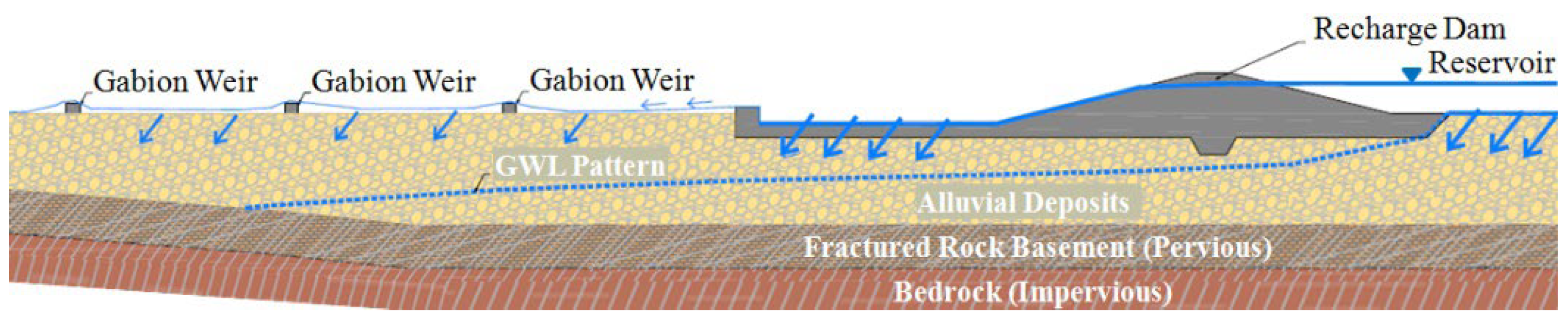 - The availability of alluvial deposit, holding the dam, which should possibly be constituted by permeable coarse sediments (gravel and sand) that allow the quick infiltration to the aquifer without interruption by low transmissivity layers as silty, clayey, or cemented ones.