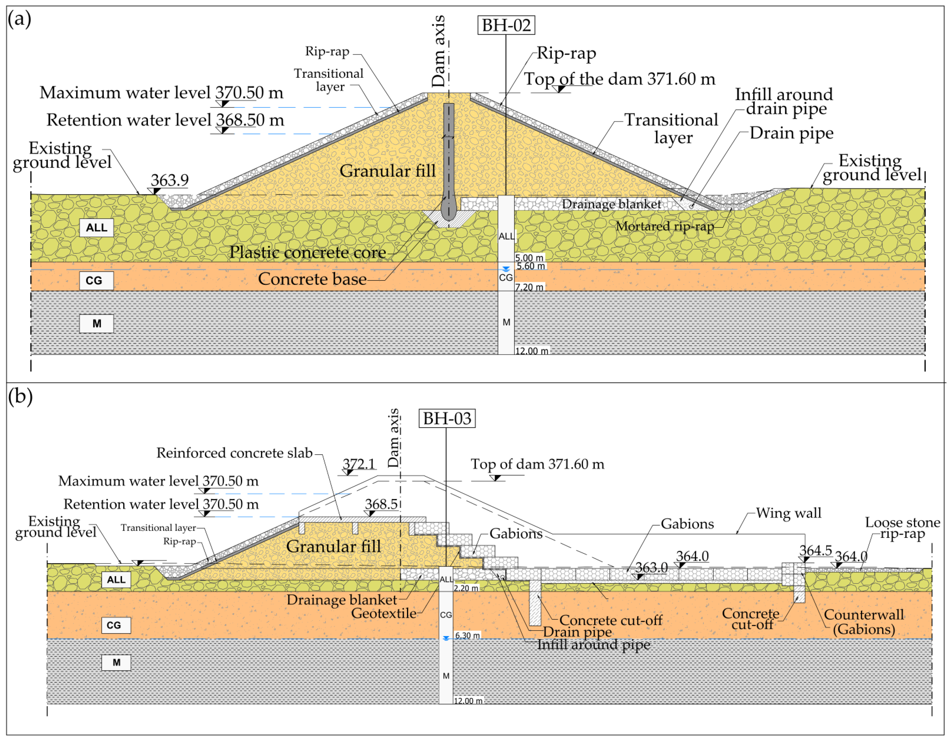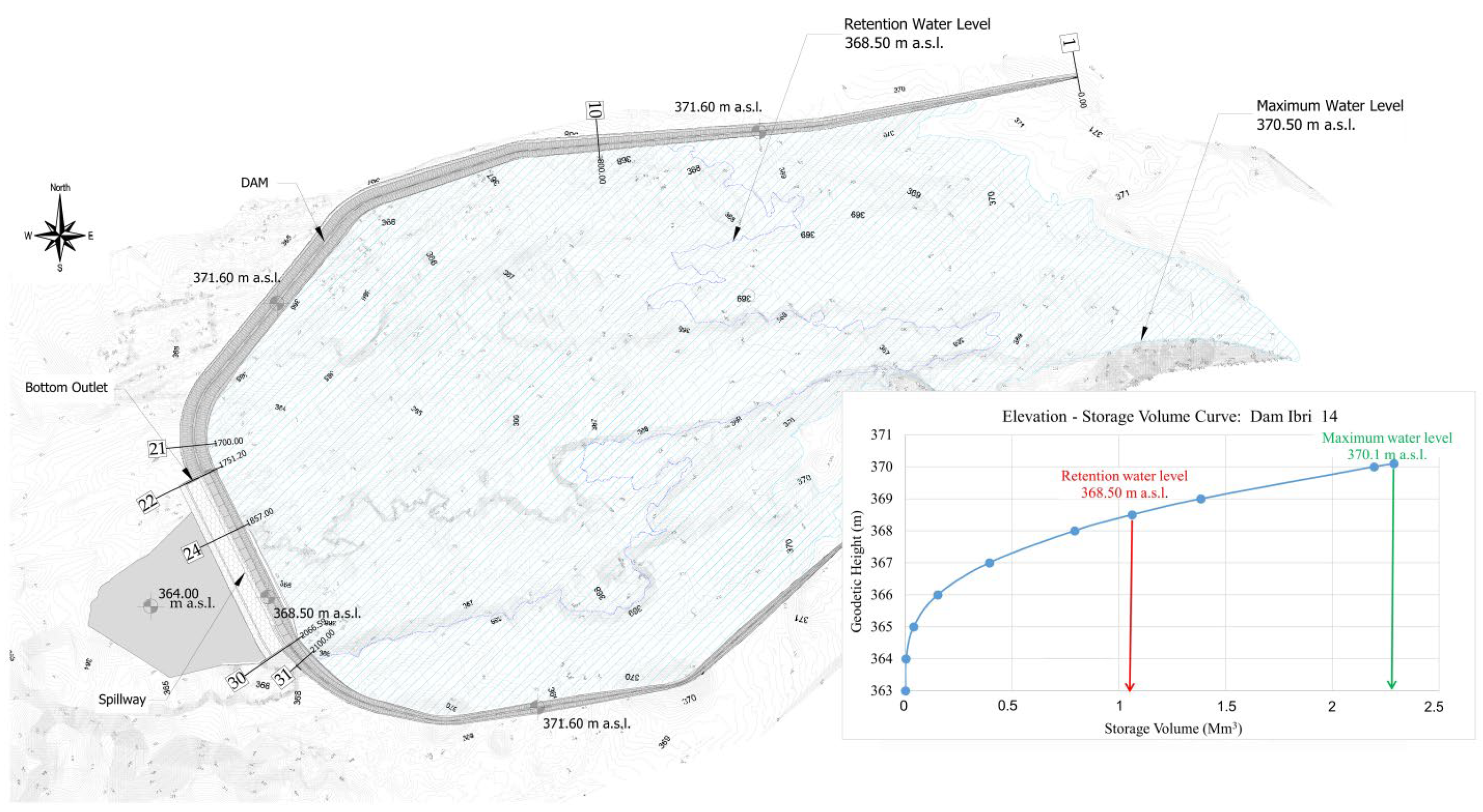 | Maximum Dam Height H (m) | Alignment Length (m) | Maximum Water Level RWL (m a.s.l.) | Retention Water Level MWL (m a.s.l.) | Dam Crest Level (m a.s.l.) | Freeboard (m) | Crest Width (m) | Total Volume of the Dam (m3) |