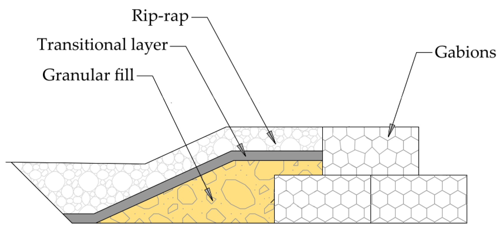 - USDA (United States Department of Agriculture). Riprap for Slope Protection Against Wave Action Technical Release; USDA: Washington, DC, USA, 1983; Volume 69. [Google Scholar]