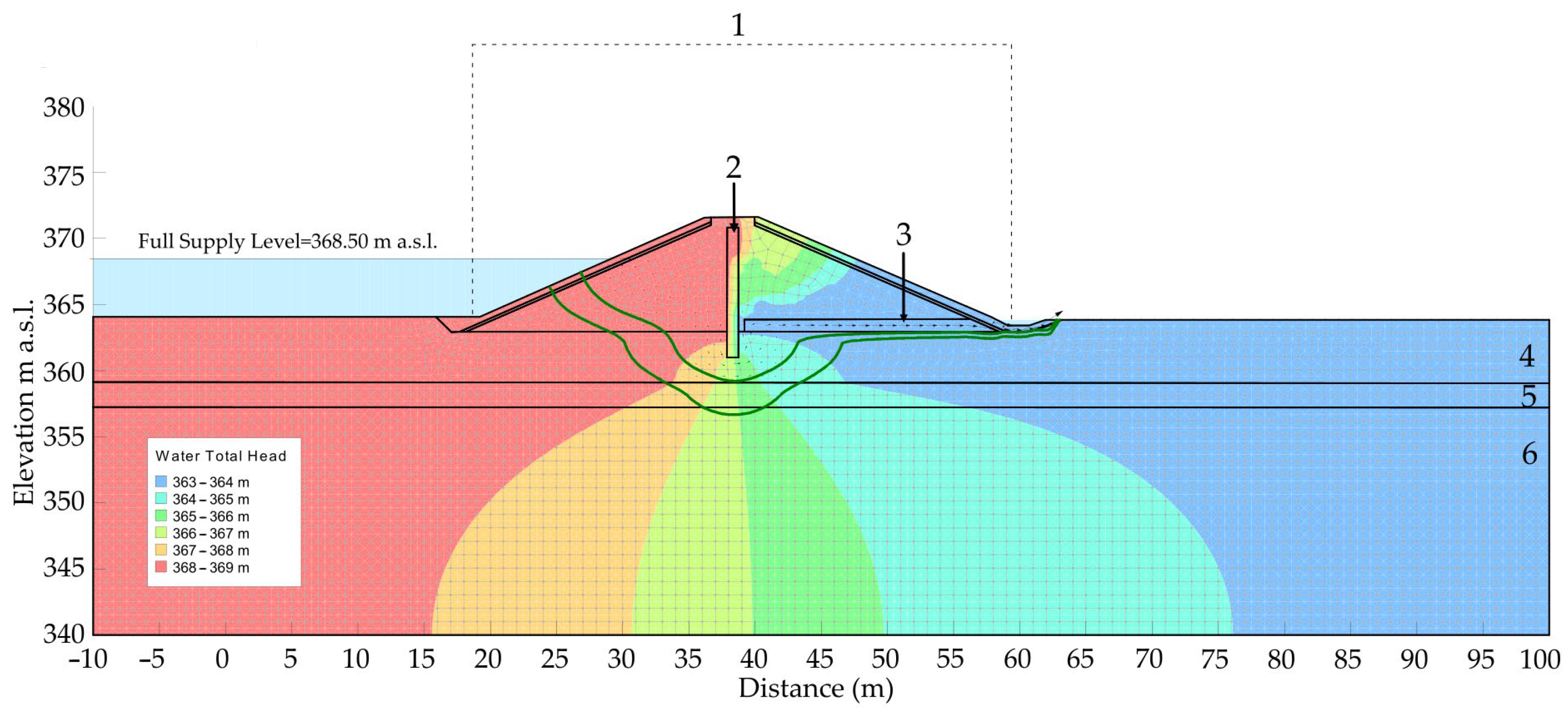 - U.S. Army Corps of Engineers. Seepage Analysis and Control for Dams; Engineer Manual EM 1110-2-1901; U.S. Army Corps of Engineers: Washington, DC, USA, 1993. [Google Scholar]