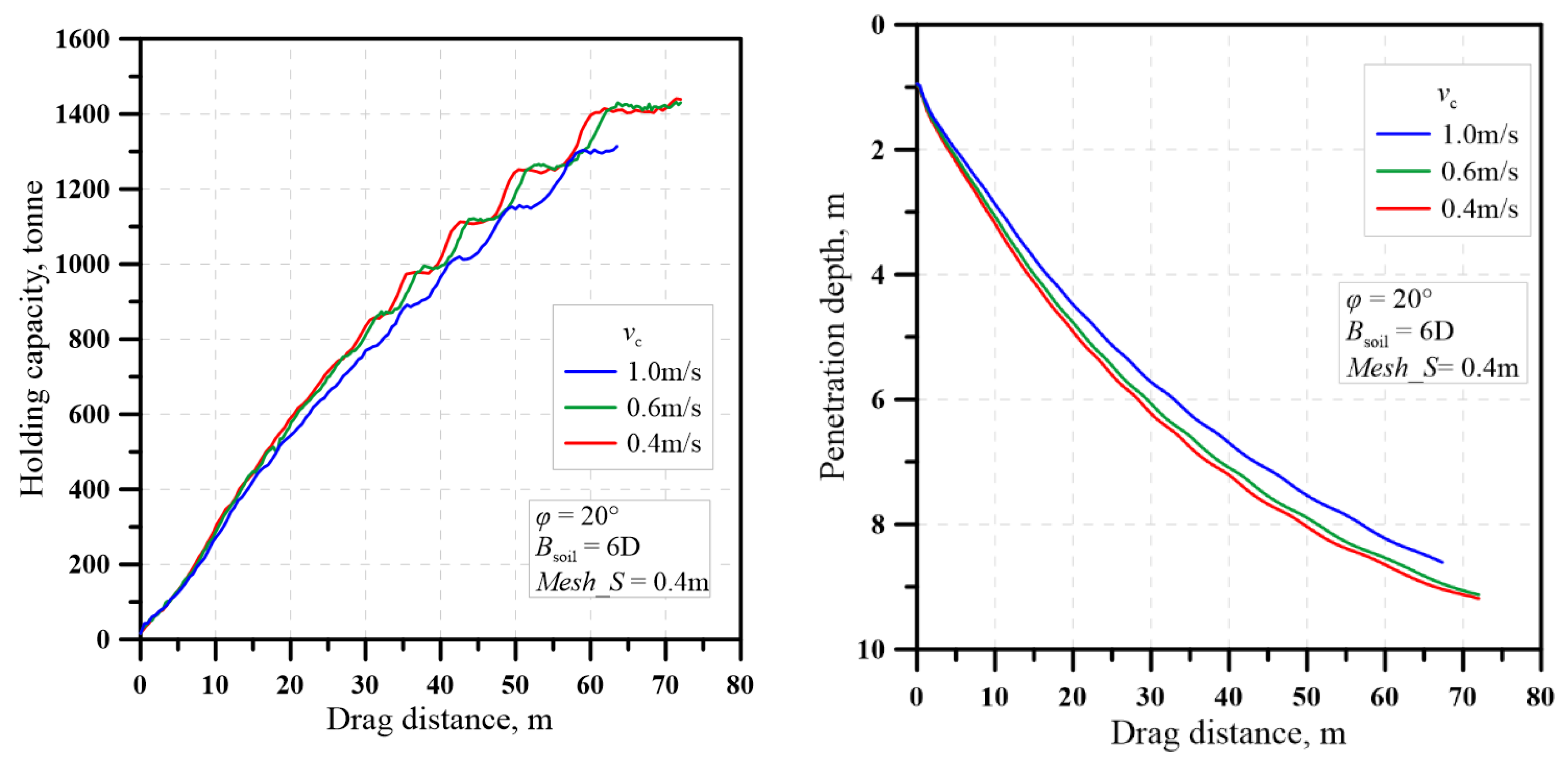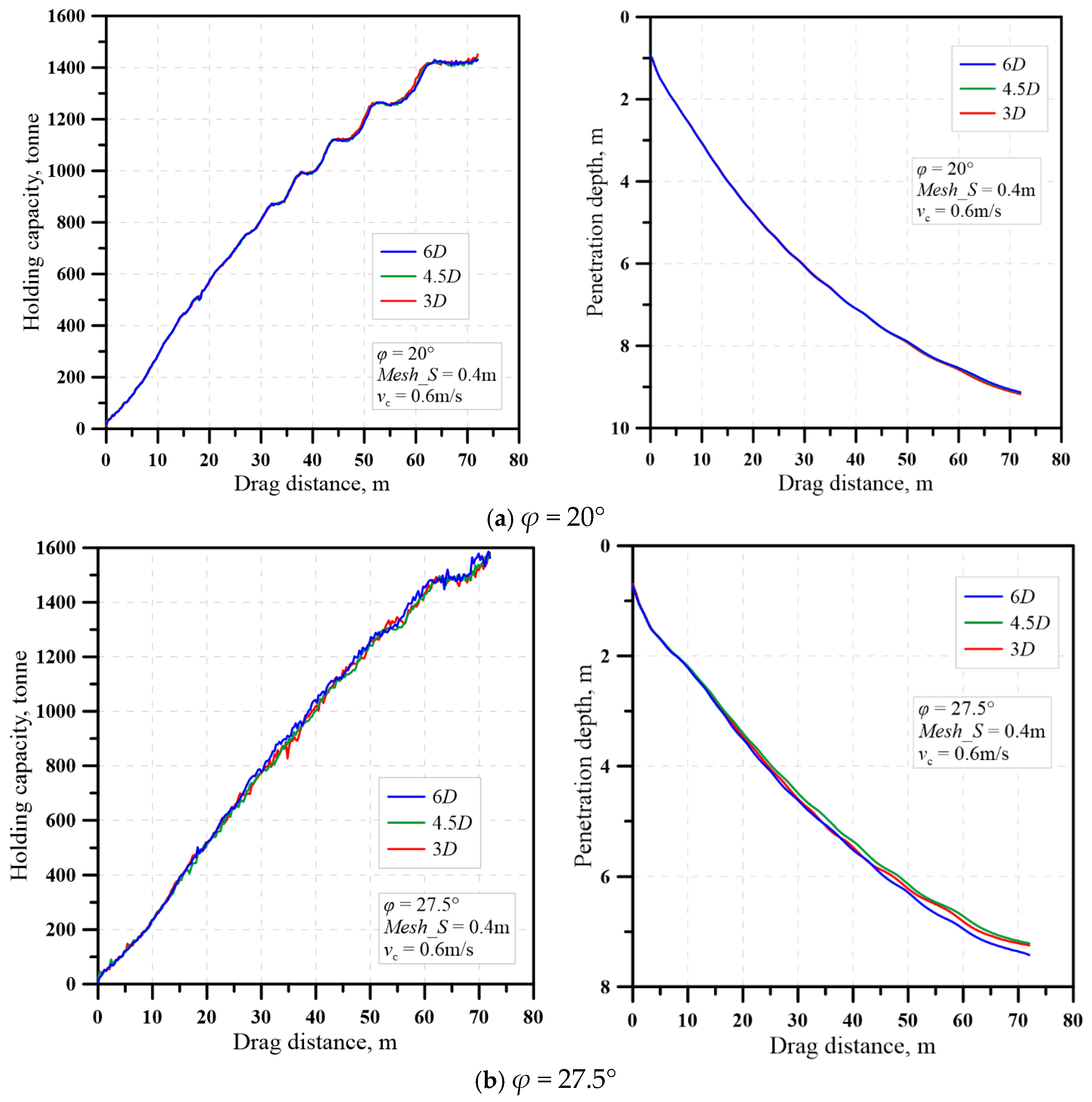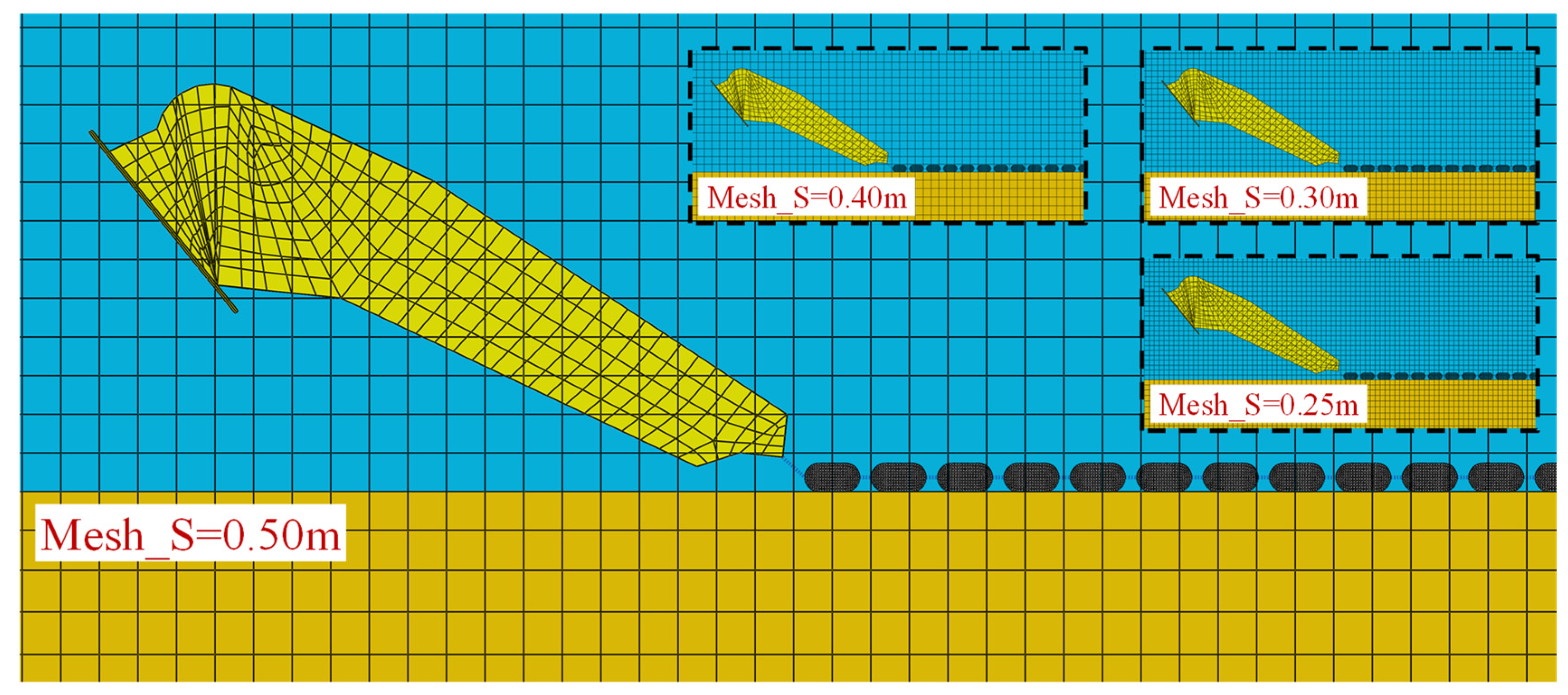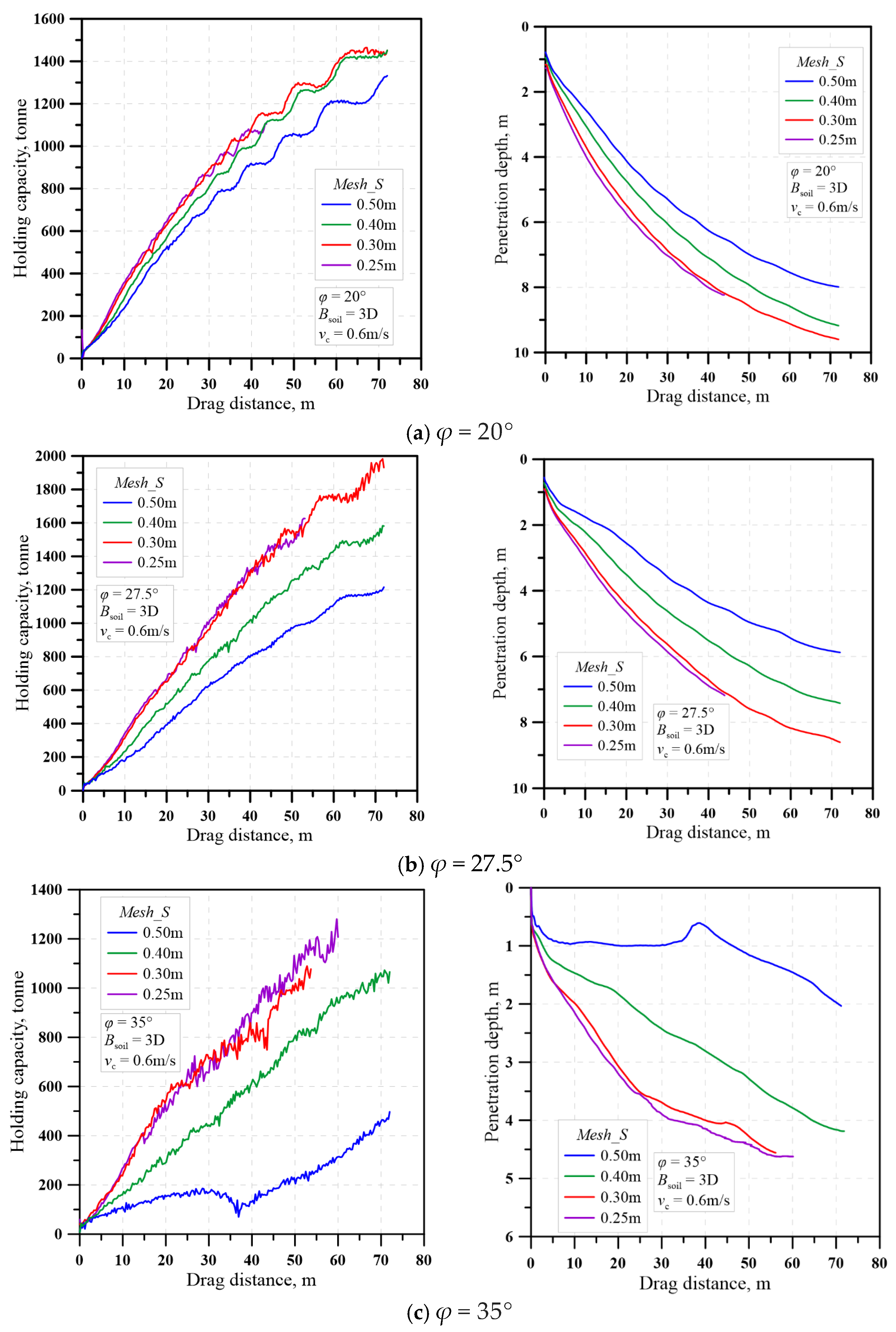 - Mesh size in the drag area—Mesh_S = 0.25 m, 0.3 m, 0.4 m, and 0.5 m—for which three sets of analyses with three friction angles (φ = 20°, 27.5° and 35°) are performed.