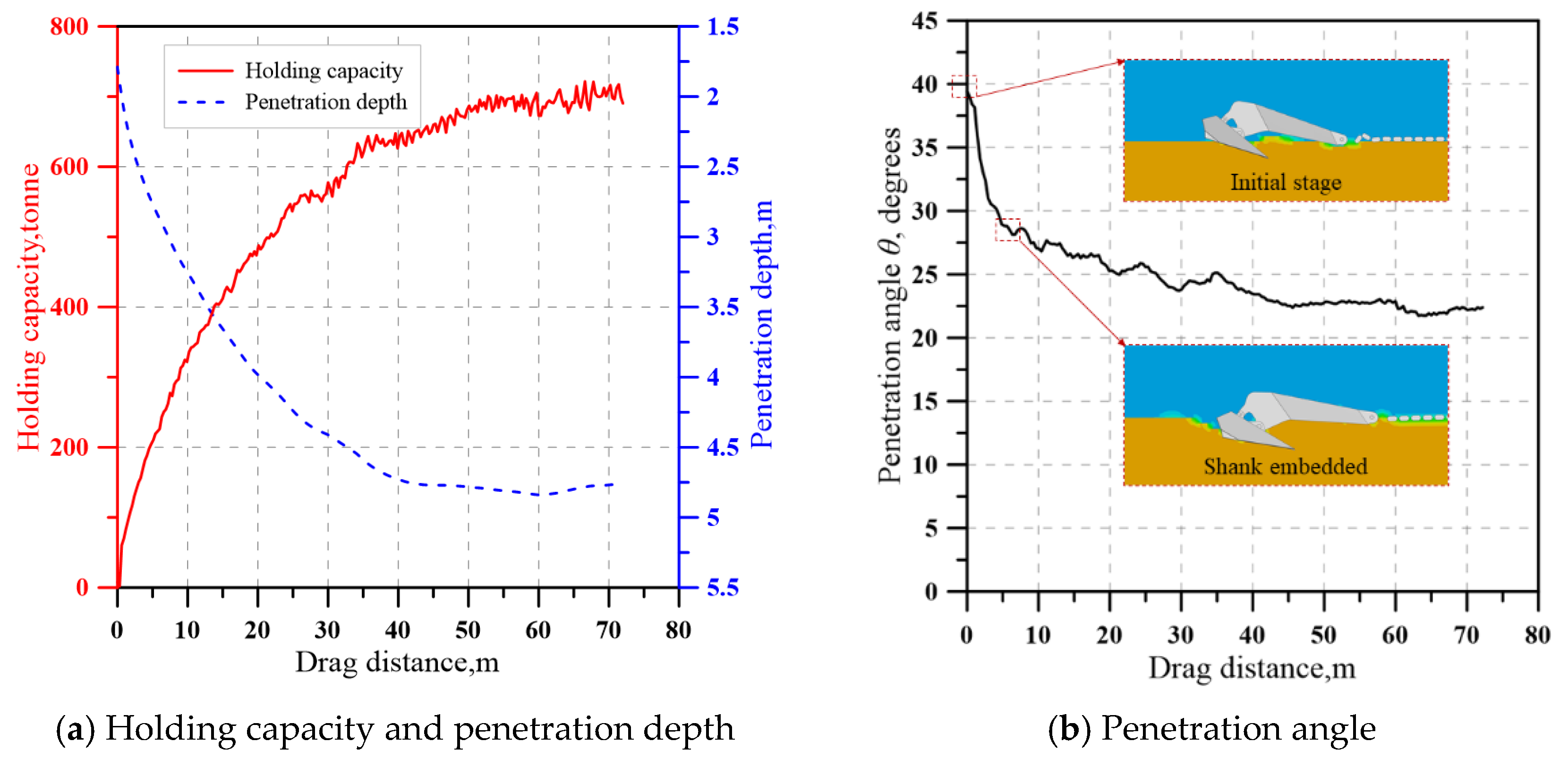 - Initial stage: The DEA rests on the seabed in a “bowing” posture, and the chain is laid flat on the seabed. The tip of fluke achieves an initial penetration of about 1.8 m due to the self-weight of the anchor.