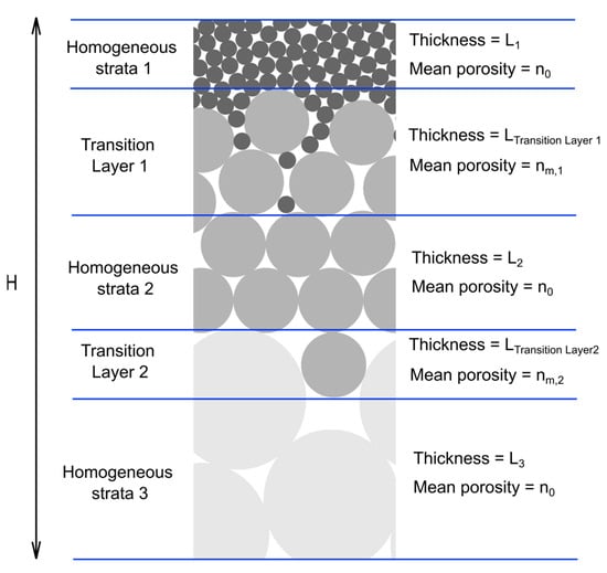 To investigate the porosity differences between layered and random samples composed of the same sediments, this study couples the density-distribution-based porosity prediction model introduced in the previous section with the Yu & Standish model [,]. This section considers two limiting cases of layered sediment structures: