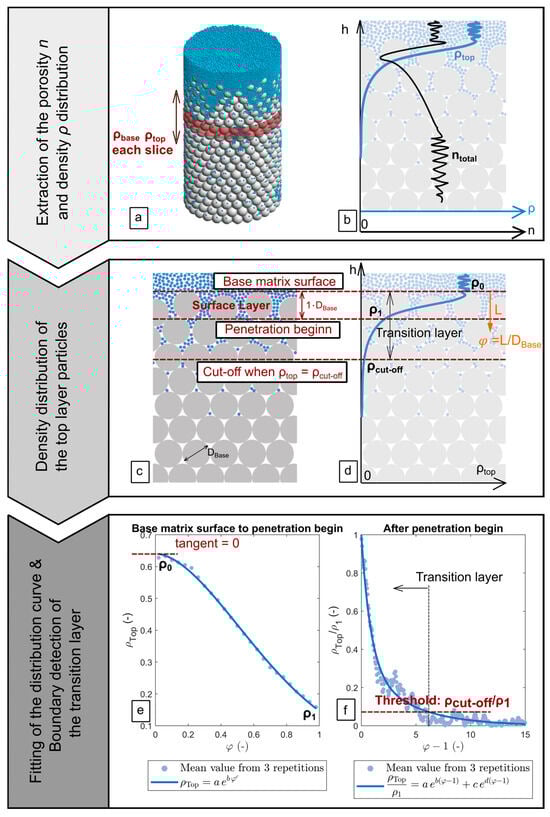 (a) Slicing of a sample and calculation of the volumes of top-layer particles, base-layer particles, and all particles within each slice. (b) Calculation of the total porosity distribution of the sample and the vertical distribution of top-layer particle density. (c,d) Schematic illustration of the transition layer boundary determined based on the distribution of top-layer particle density. (e) Exponential fitting of the top-layer particle density distribution between the base matrix surface and the penetration begin line. (f) Exponential fitting of the top-layer particle density distribution below the penetration begin line.