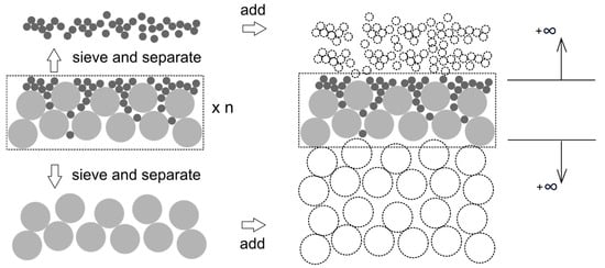 Based on the 1000 grain-size-decreasing sediment samples without homogeneous layers generated in the previous section, this study investigates the limiting case where the thickness of each homogeneous layer is gradually increased while maintaining constant volume fractions for each grain size. As the thickness approaches infinity, nstratified approaches n0. This scenario is conceptually feasible: as illustrated in Figure 8, imagine duplicating a transition layer n times, separating the upper and lower particles by sieving. These sorted particles are then added to the respective upper and lower homogeneous layers to continuously increase their thickness. Throughout this process, the volume fractions of the various grain sizes remain unchanged.