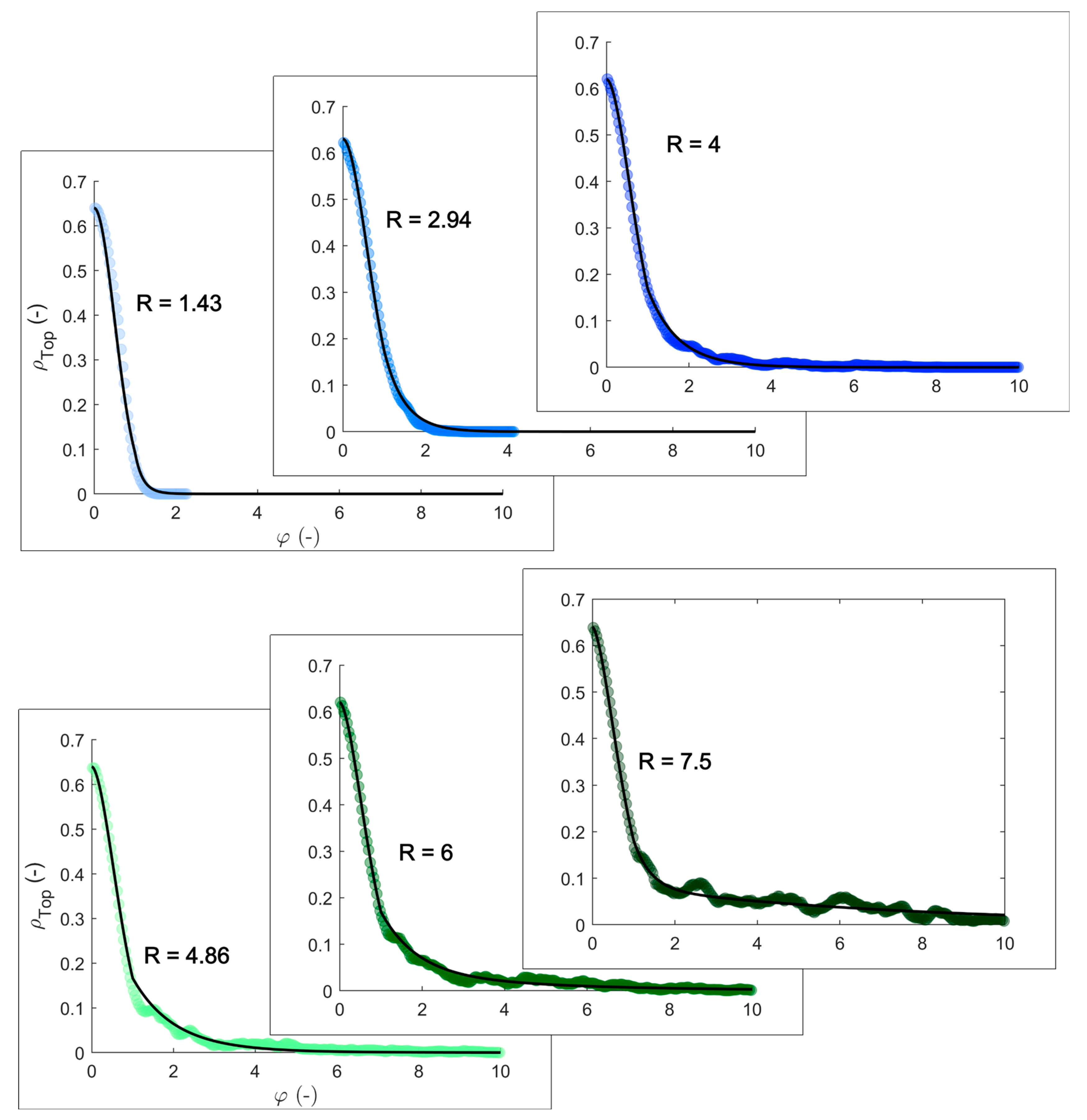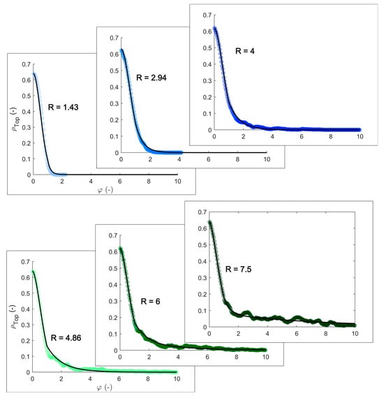Using the empirical models (8)–(11), the density distribution curves of infiltrating top-layer particles can be predicted. As shown in Figure 9, six measured infiltrating particle density curves for different R values from the numerical simulations are presented as examples. For comparison, the predicted distribution curves from the empirical models are shown as black solid lines. It can be observed that the predicted curves closely match the measured ones.