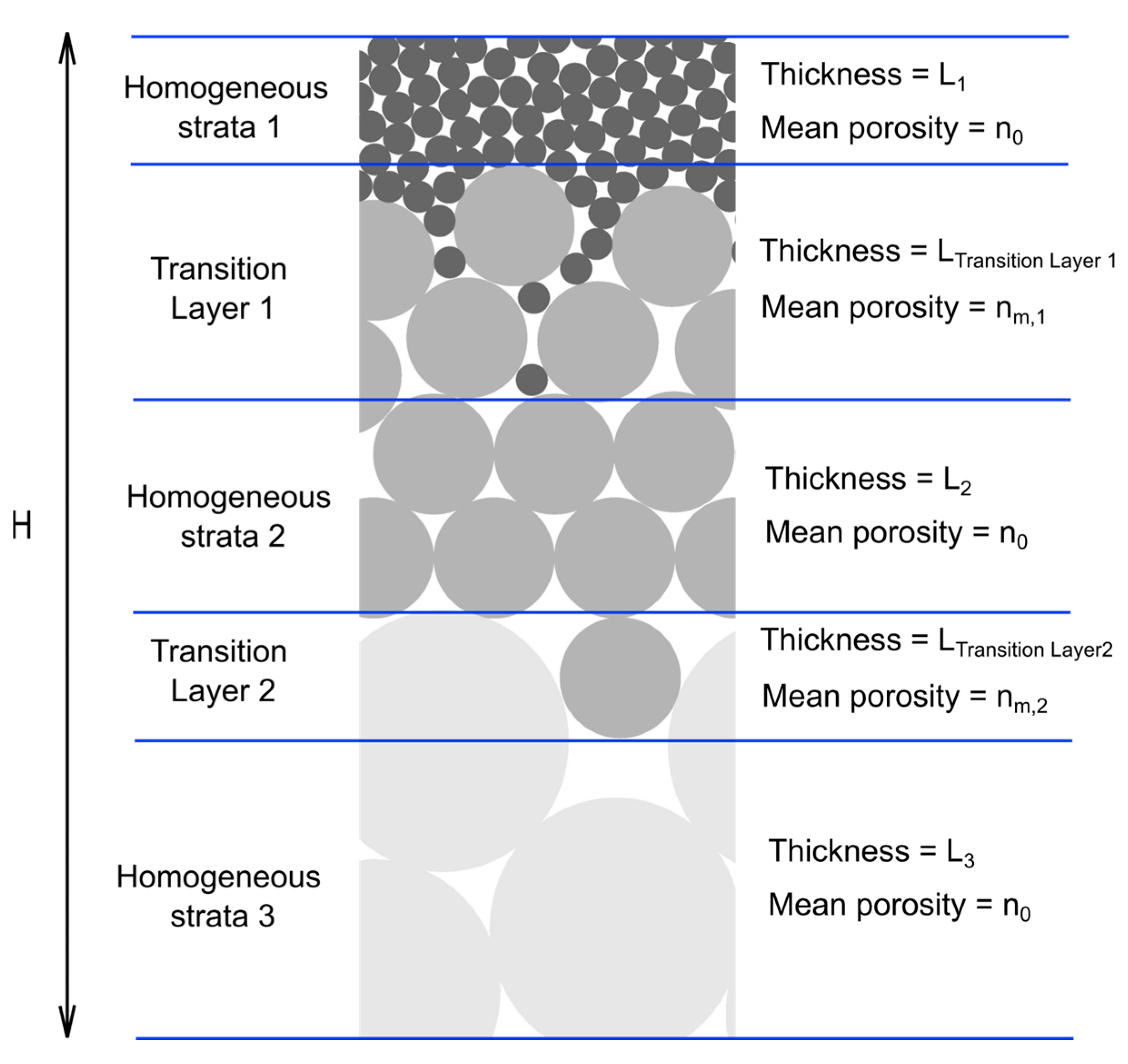 As established in Part I, a stratified sample can be conceptually divided into homogeneous layers, where porosity is relatively constant and known (typically between 0.36 and 0.4), and inhomogeneous transition layers, where porosity varies due to grain interpenetration. Accurately determining the length and porosity of each transition layer is thus a prerequisite for predicting the average porosity of a stratified sample (Figure 1):