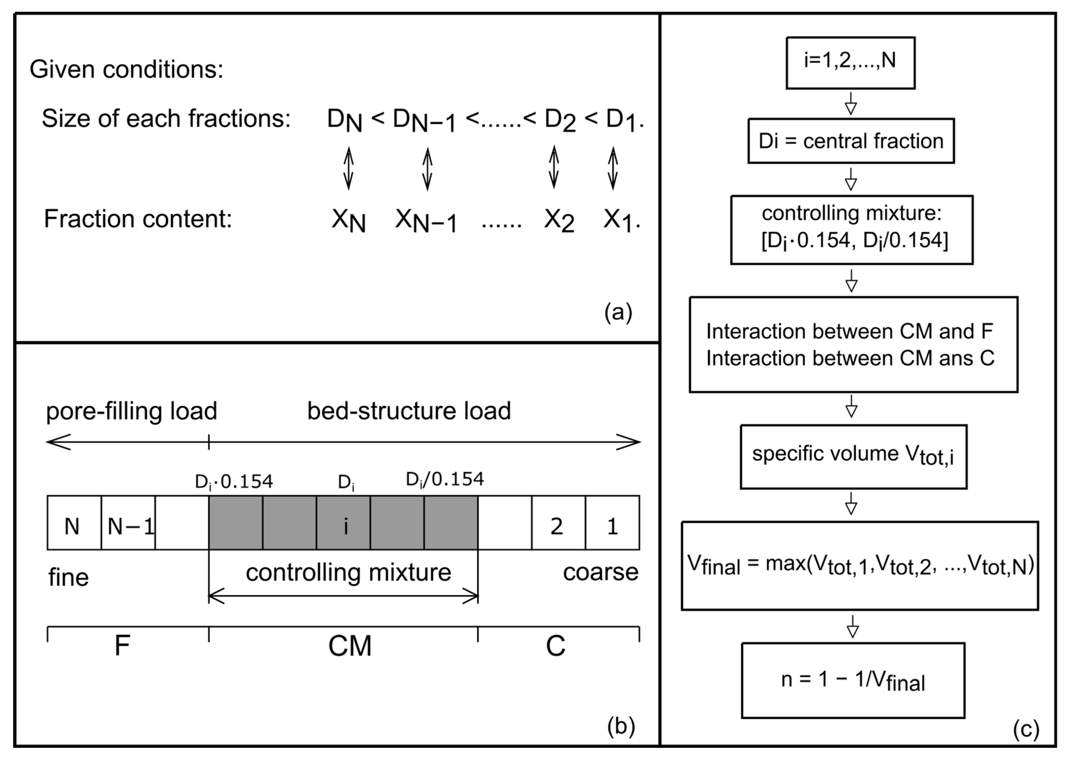 Building on this concept, Yu & Standish [,] extended their model to multi-fraction mixtures by assuming that a linear relationship between Vtot and X also holds for these more complex systems. Central to their method is the idea of a controlling mixture, which includes a central fraction with a representative particle size Di, and the coarsest and finest fractions at sizes Di/0.154 and Di⋅0.154, respectively (Figure 2a,b). Here, 0.154 corresponds to the size ratio between fine and coarse grains to allow the fine grains to pass through the pores built by coarse grains in a tetrahedral packing []. Particles finer than Di⋅0.154 are assumed to act as pore-filling particles, meaning they occupy the voids of the controlling mixture without altering its structural framework.