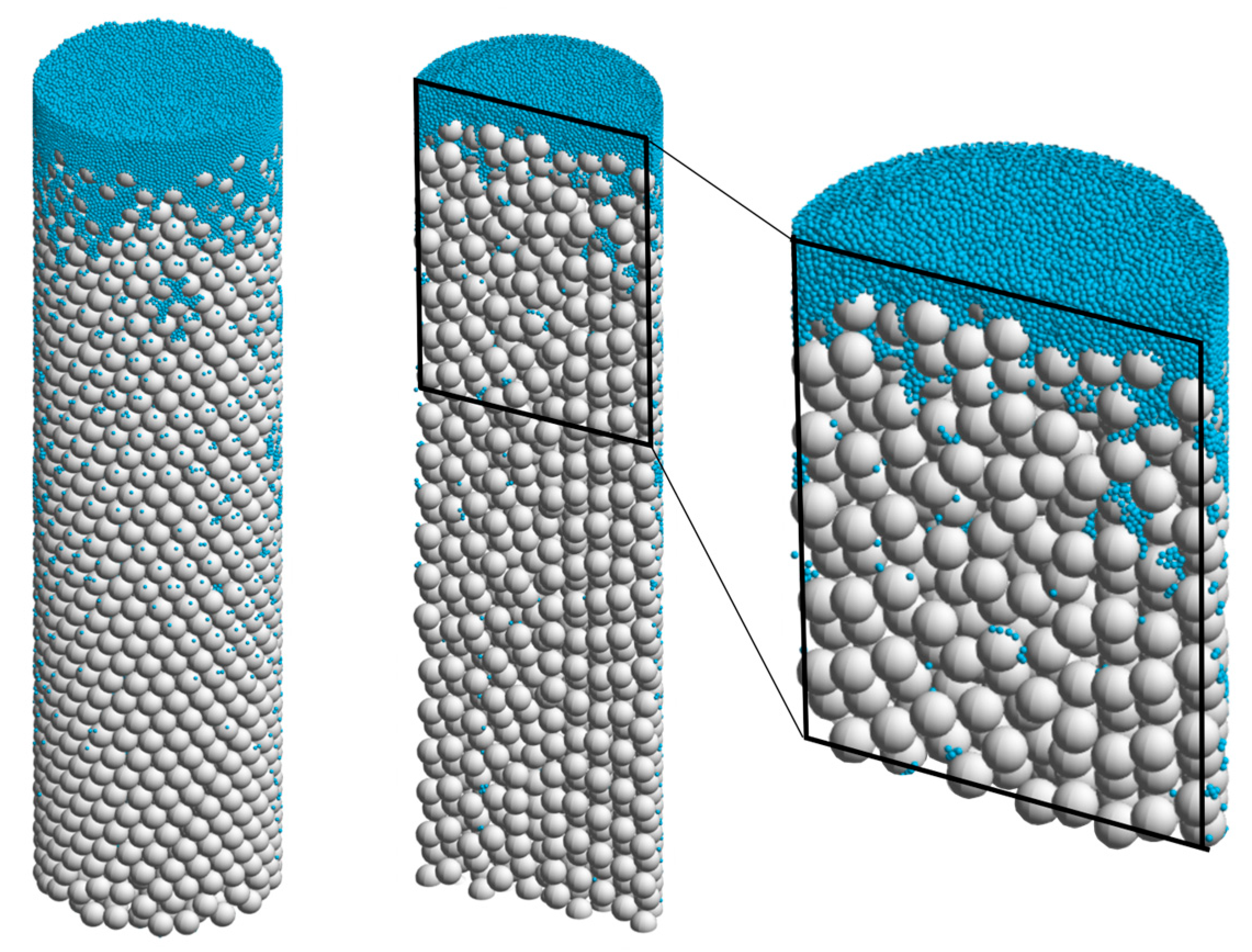 In the numerical simulations, stratified samples were generated by sequentially depositing spherical particles of different sizes into a cylindrical container (Figure 3). During deposition, particles fell freely under gravity, and their motion—including collisions with other particles and the container walls—was fully resolved. To promote denser packing at the base, vibrations were applied during the deposition of the base-layer particles; this vibration was disabled during the deposition of the top layer.