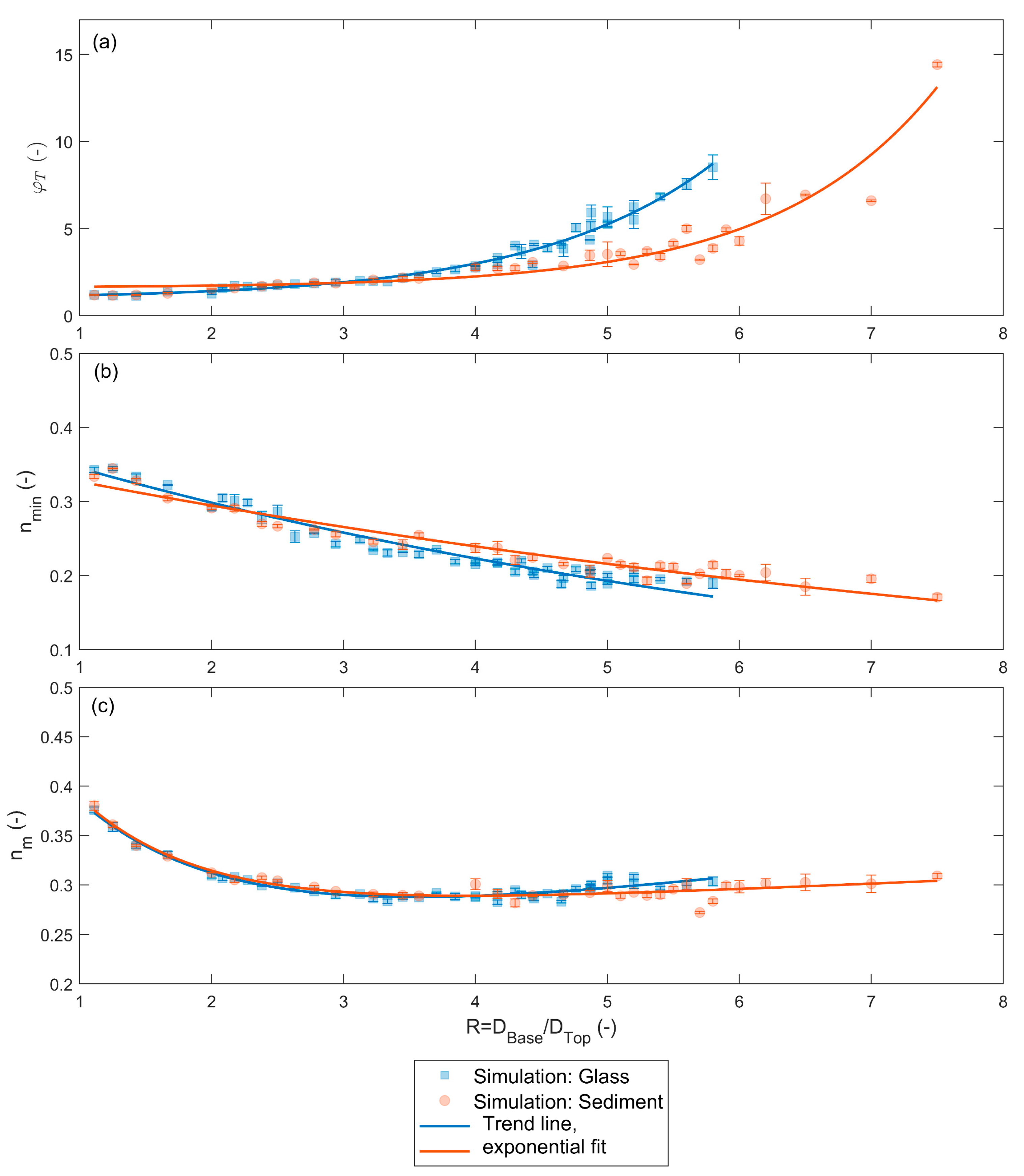 The lower limit of minimum porosity appears to be largely independent of material type. However, across the entire range of R, natural sediment consistently exhibits slightly higher nmin values than glass beads. This difference is likely due to the looser packing arrangement of fine natural sediment particles as they infiltrate the base layer, possibly influenced by higher surface friction. The relationship between nmin and R for natural sediment is captured by the following empirical formula: