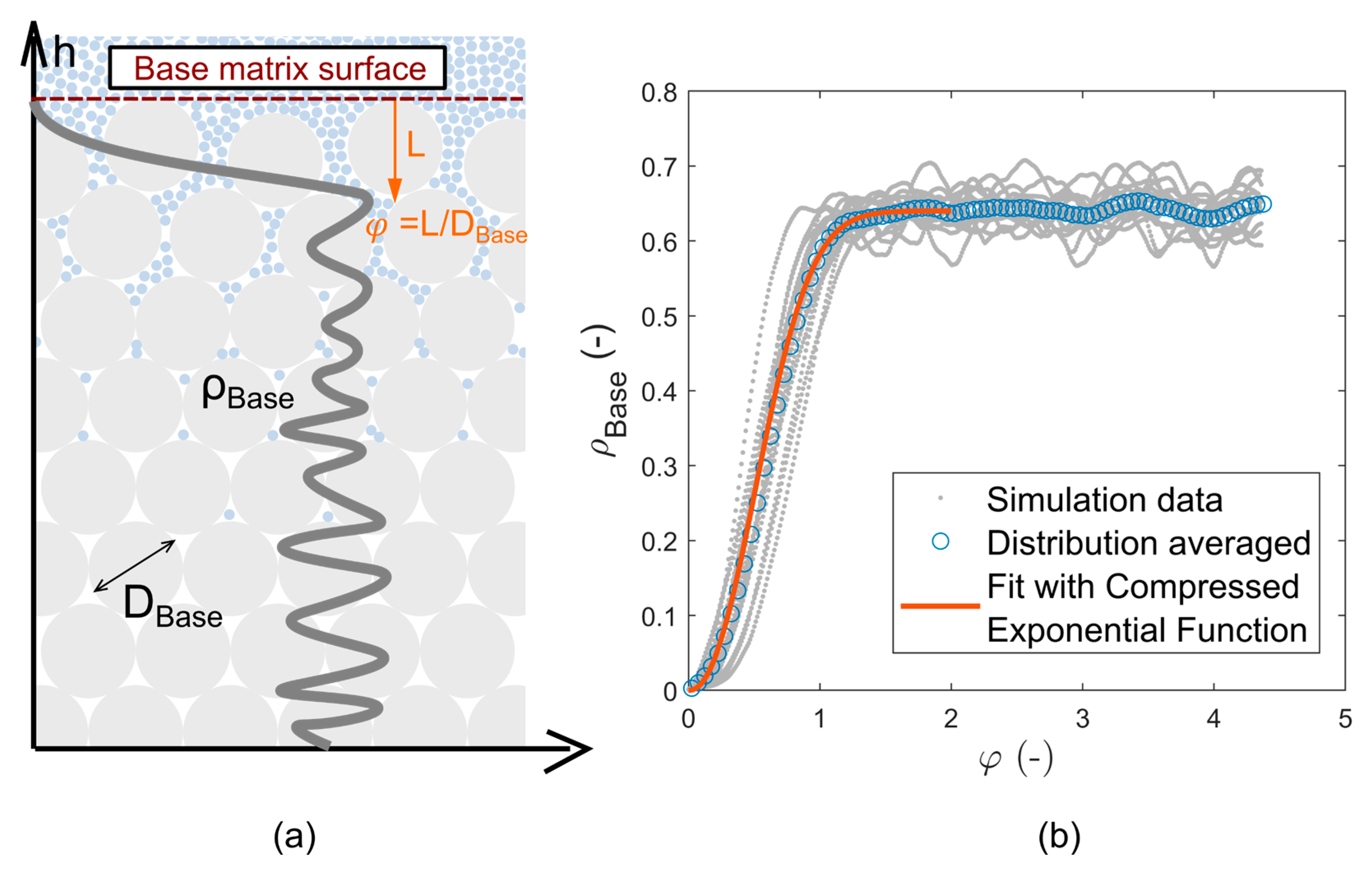 Prediction of Base-Layer Particle Density: Unlike the top-layer particle density distribution introduced in the previous section, the base-layer density distribution ρBase is independent of the particle size ratio R. By analyzing the average base-layer density distribution from over 50 numerically simulated samples (Figure 6), a compressed exponential function was used to describe the relationship between ρBase and the dimensionless depth φ (RMSE = 0.005, R2 = 0.985):