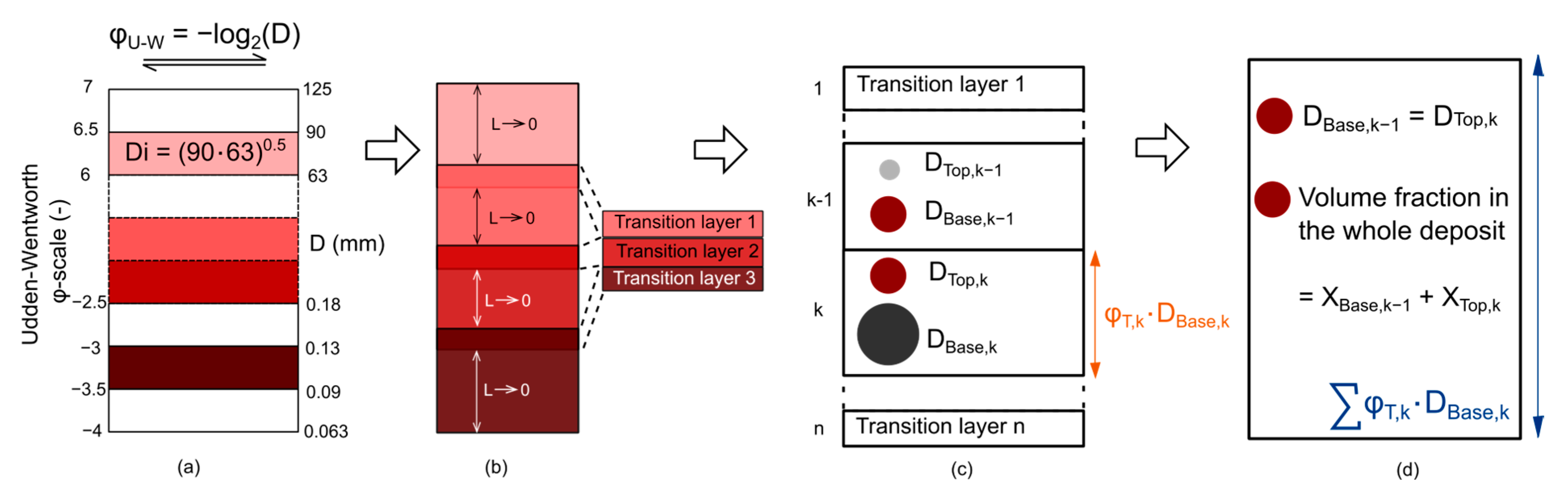 It is worth noting that the grain size of the base-layer sediment in the (k − 1)-th transition layer is identical to that of the top-layer sediment in the k-th transition layer (Figure 7d). Therefore, the volume ratios calculated separately for these two layers need to be summed:
