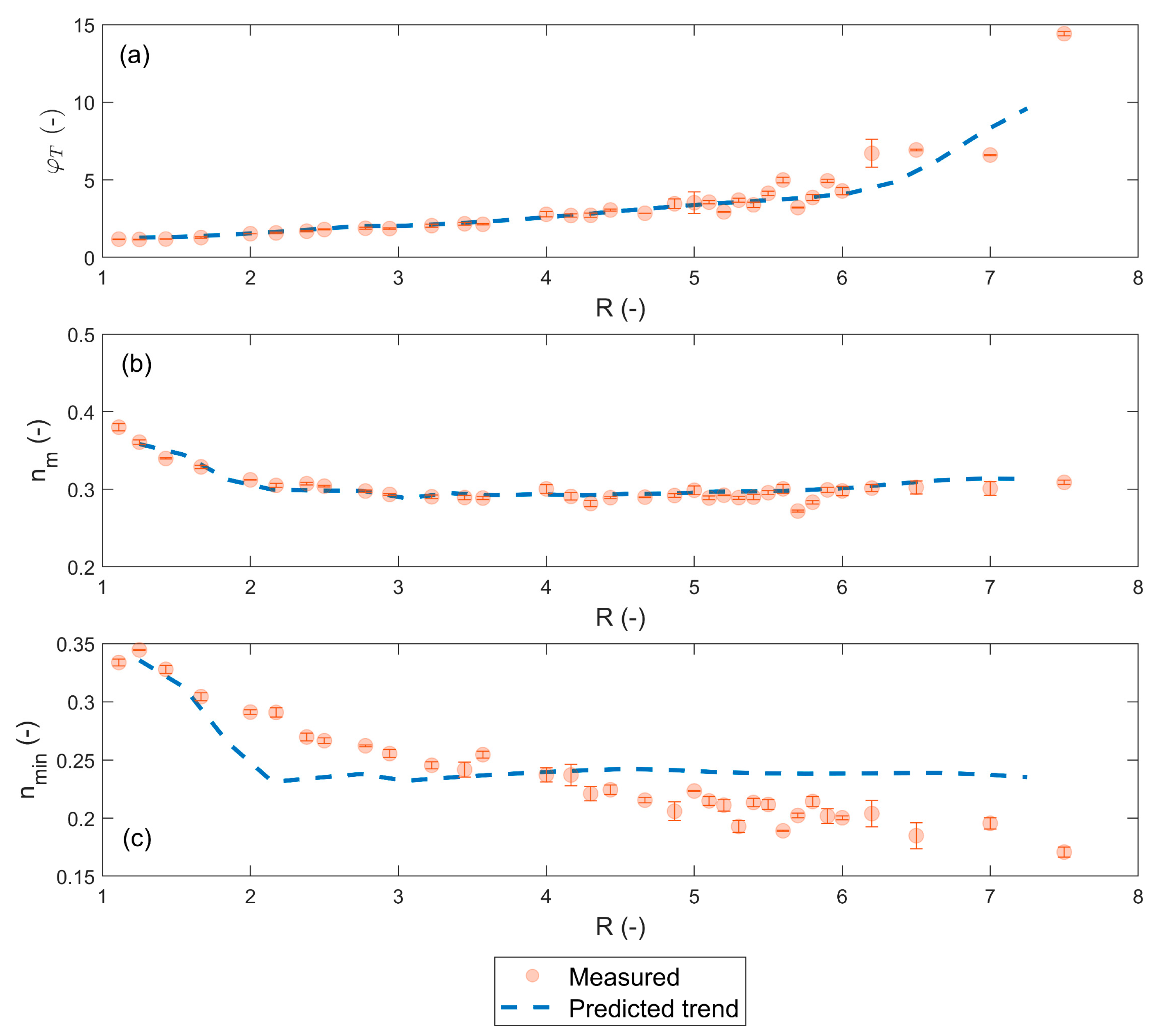 Based on the empirical models (8)–(12), this study further calculated the predicted transition layer length φT for each R value. Simultaneously, predictions for nmin and nm were obtained using Equations (13) and (14). In Figure 10 and Figure 11, the measured values of these three parameters are compared with their corresponding predictions from the empirical formulas.