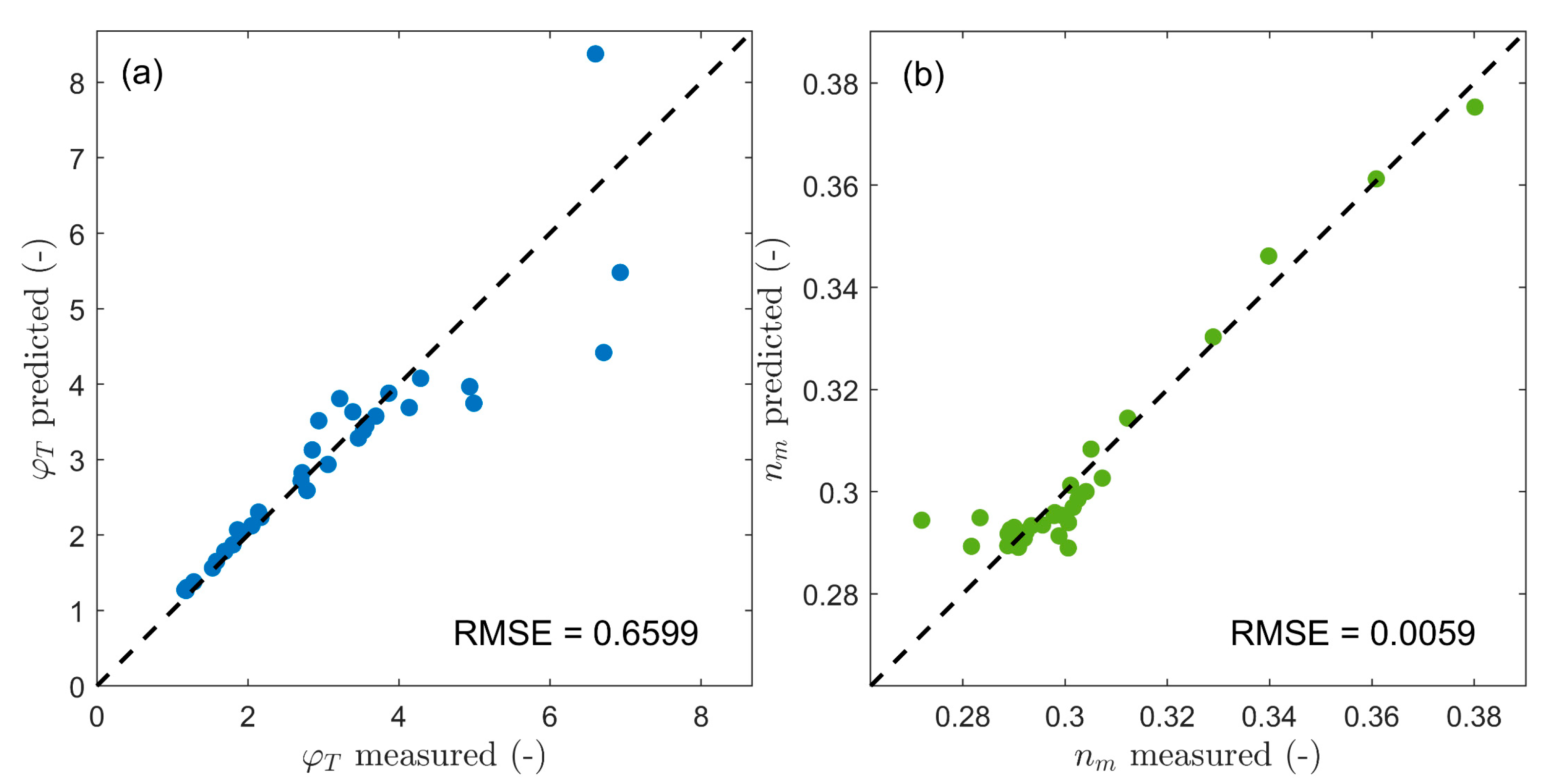 (a) Comparison of measured and empirical model predicted values of dimensionless transition layer length φT. (b) Comparison of measured and empirical model predicted values of average porosity within the transition layer nm.