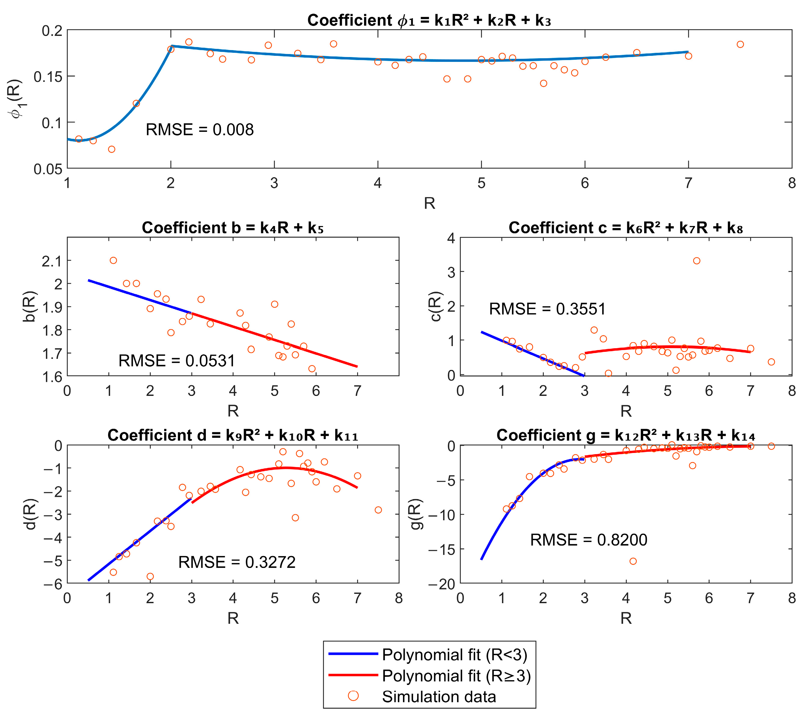To maintain consistency with the mathematical expression in Equation (8), polynomial functions were also chosen for f2 through f5. The fitting results for each parameter are presented in Appendix B. The accuracy of the predicted top-layer particle density distribution based on Equations (8)−(11) will be analyzed in detail in Section 3.2.1.