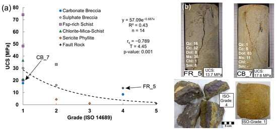 Representative samples were selected and retrieved from the Wechsel area to be tested for their UCS to verify that they were soft rocks in terms of their compressive strength (Figure 5a). All rocks except for one showed UCS values below 50 MPa, resulting in a moderate correlation between slaking grade according to ISO 14689 and the UCS. The classification of the remaining rocks from the St. Florian Beds was based on field assessments following the ISO 14689 guidelines. Clay and siltstones were assigned to categories R0 to R2 according to ISRM 1978 [36], qualifying them as weak rock [40]. All cataclastic and disturbed rocks (fault rocks), as well as all carbonate breccias (except for one sample), were assigned to ISO 14689 grades 4 and 5 (Figure 5b)—grade 3 comprised sericite phyllites, fsp-rich schists, and clay/siltstones.