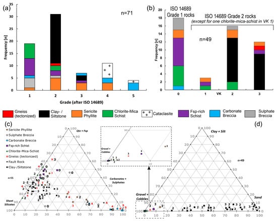 Slaking grades, mineralogical composition, and grain size distributions of the investigated rocks: (a) Slaking grades of the investigated rock after ISO 14689; (b) VK classes of the durable samples with an initial Grade 1 and Grade 2 after ISO 14689 after a total of three slaking cycles; (c) ternary diagram showing the mineralogical composition of the investigated rock samples with the assigned ISO grades (red numbers) and VK classes (black numbers); (d) ternary diagram of the grain size distribution after the WDmod [7].