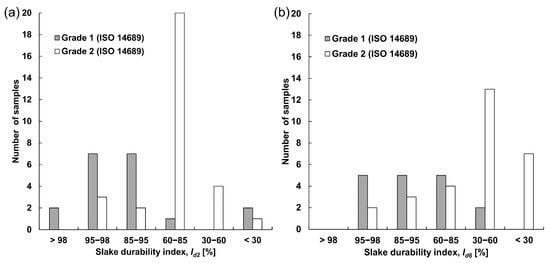 Grade 2 samples exhibited greater variability in Id2 values; most fell within the 60–85% range and were classified as moderately resistant to slaking. After six cycles, none of the samples remained in the highest durability class, and most of the Grade 2 rocks were found in the two lowest classes (Figure 8b). Conversely, none of the Grade 1 rocks degraded enough to fall into the lowest class.