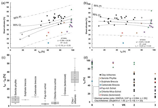 Slaking behavior in the context of the mineralogical composition and the number of testing cycles performed on the analyzed rocks: (a) Id2 vs. sheet silicate content. After only two cycles, the samples exhibited an apparent positive effect and a weak correlation between the sheet silicate content and slaking resistance; PI = prediction interval, CI = confidence interval. (b) Id6 vs. sheet silicate content. There was no correlation, and the Id decreased significantly for sedimentary, sheet silicate-rich rocks (i.e., clay- and siltstones); (c) relative decrease of Id between the 2nd and 6th cycle for the different rock types; (d) range of Id6 within the VK classes.
