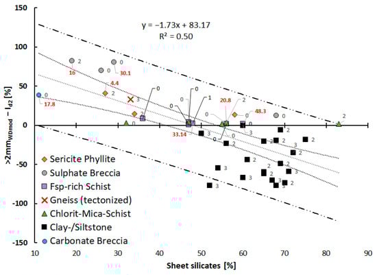 Correlation between the difference of Id and >2 mm WDmod and the content of sheet silicates. Rocks exhibiting negative values were highly sensitive to static slaking. The positive values are indicators for rocks susceptible to dynamic slaking. Black datapoint labels are the assigned VK classes, red italics labels are UCS values in MPa.