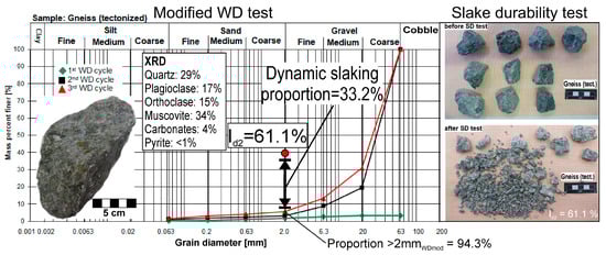 One might intuitively expect dynamic action to result in greater rock degradation than static conditions. However, the values range from +80% to −80% for the dataset under investigation (Figure 10). Very weak rocks, such as clay and siltstones, exhibited negative values, indicating that they are more degraded after three repetitive wetting–drying cycles at 24 h each than after two dynamic cycles of the slake durability test. Soft, sheet silicate-rich crystalline rocks tended to exhibit the same slaking behavior in the two types of tests, suggesting that there is little to no difference between static and dynamic slaking behavior. The more positive the values, the higher the dynamic slaking sensitivity compared to static conditions. For these types of rocks, a higher sheet silicate content is associated with less dynamic action required to degrade the rock during the slake durability test. Sulfate breccias, for example, exhibit very high values and are already degraded after two slake durability cycles despite showing almost no slaking in the wetting–drying cycles. None of the VK 0 and VK 1 rocks plotted in the negative field around the zero axis, which confirms their high slaking resistance. VK 2 data points are present in both regions, and except for one sample, VK 3 data points are present only in the negative region. Crystalline rocks that have experienced grain size and cohesion reduction due to shearing are less susceptible to static slaking than inherently fine-grained rocks. Unlike clay-siltstones, the tectonized gneiss sample (Figure 11) did not crumble under static conditions nor did it develop a negative ratio of 2 mm WDmod to Id2. Mineralogical analysis by XRD revealed no neoformation of clay minerals that could lead to more severe static slaking, with muscovite being the only sheet silicate species present in this rock.