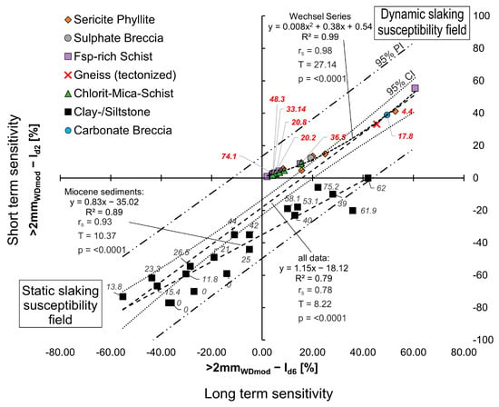 Plot of the dynamic components after two and six slaking cycles to determine the slaking sensitivity of rocks. Crystalline and diagenetic cemented sediments are plotted in the upper right quadrant, where the dynamic slaking component increased with more positive values. Rocks near the origin are resistant to slaking in the short and long term (red italicized numbers indicate the UCS). Miocene sediments (clay- and siltstones) are plotted in the lower left and lower right quadrants. The more negative the values, the more the rock is prone to slaking under static conditions and tends to crumble into smaller fragments (Datapoint labels show the proportion > 2 mm WDmod). Note that the slaking assessment is of a qualitative nature, as well as a function of the laboratory tests conducted in the course of this investigation.