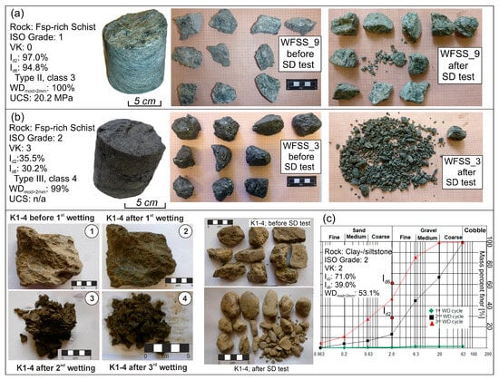 To assess long-term slaking sensitivity, the Id2 and Id6 are linked to the >2 mm WDmod. Figure 12 shows a diagram that allows one to qualitatively determine the slaking sensitivity of different rock types. The more negative the value, the higher the static slaking sensitivity of a rock when it comes in contact with water. The plot also shows that fine-grained, sedimentary, sheet silicate-rich rocks lie at or below the zero percent line. Static slaking does not seem to affect fine-grained, soft, crystalline rocks (e.g., phyllites and micaschists), as material loss mostly occurs through the removal of surficial material along structurally defined features, such as foliation planes, during mechanical action, as occurs in the rotating drums during the slake durability test. These rocks lose material in a layer-by-layer pattern rather than breaking apart from the inside, resulting in rounded components where the ten initial fragments remain largely intact. However, some flakes were removed from the samples, classifying them as Type II (ASTM D 4644) and Class 3 (DGGT Rec. No.20) (Table 2; Figure 13a). If the fabric’s integrity is already significantly degraded, fragmentation similar to that observed in clastic sedimentary rocks may occur (Figure 13b).