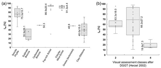Ranges of Id6: (a) Range of the Id6 for each rock type; (b) range of the Id6 within the visual assessment classes. None of the samples fell into class 1 [44].