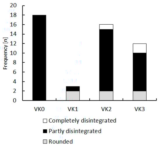 Table 2 shows the ASTM D 4644 classifications [43] and the DGGT recommendations [44] for comparison. Figure 14a illustrates the range of the visual assessment in relation to the slake durability index, emphasizing the issue of the quantity of rock pieces greater than 2 mm that remained in the drum after six cycles, relative to the grain size characteristics of the retained fragments. In class 3, for example, the Id ranges from 20% to nearly 100% (Figure 14b), indicating that, despite crumbling into smaller pieces, the rocks still exhibited very high slaking resistance in the slake durability test. At the same time, class 3 rocks after DGGT are present in all VK classes (Figure 15). When transferred to real site conditions, such as a cut slope, the Id would yield an overly optimistic assessment.