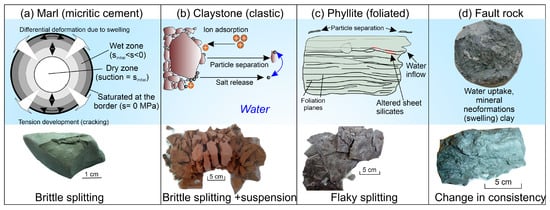 Slaking patterns observed in different soft and weak rocks: (a) Dense and compact marl (sketch reprinted/adapted with permission from Alonso et al. (2010) [72]. Copyright 2010, Geological Society of London); (b) fine-grained clastic sediment (sketch reprinted/adapted with permission from Liu et al. (2023) [24]. Copyright CC-BY (2023), the authors); (c) phyllite with closely spaced foliation acting as entry points and surfaces for water and mineral alterations, respectively; (d) fault rock exhibiting a plastic behavior after water uptake.