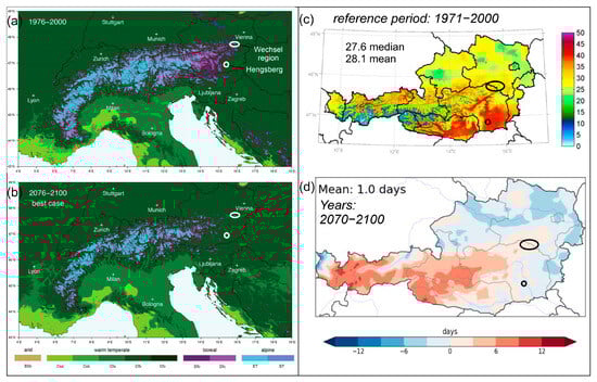 Climate scenarios for Austria: (a) Current Köppen–Geiger climate classification based on observed HISTALP data (Reprinted/adapted with permission from Rubel et al. (2017) [80]. Copyright 2016, the authors); (b) shift of climate zones anticipating a best-case scenario of RCP 2.6. (Climate codes: C = warm temperature, D = snow, E = polar, T = tundra, f = fully humid, a = hot summer, b = warm summer, and c = cool summer); (c) distribution of freeze–thaw days in Austria; (d) long-term change in freeze–thaw days (Reprinted/adapted with permission from Chimani et al. (2016) [78]. Copyright CC-BY-4.0 (2016), GeoSphere Austria).