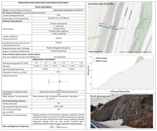 The road infrastructure asset maintenance and inspection routines should be adapted and individualized based on the climatic conditions, local topographic setting, and geologic setting. Figure 18 shows a suggested structure for a standardized inspection protocol with the relevant field- and laboratory-based assessment methods. The rock sample exhibits low slaking under dynamic and static conditions, with low liberation of fines. It is located in an area that experiences 25 freeze–thaw cycles, and it is exposed along a road cut with mesh protection. Freeze–thaw cycles have a more pronounced impact on rock weathering than wetting–drying alone, leading to an accelerated rate of degradation that necessitates enhanced surface protection. Systematically identifying vulnerable hotspots enables the targeted implementation of additional protective measures—such as soil nails, surface coverings, or grading—to reduce the risk of catastrophic failure during high-intensity rainfall events [81,82].