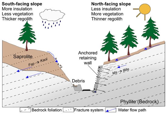 Climate, exposure, and rock structure controlled the degradation of a soft rock slope, such as phyllite, and associated practical considerations for infrastructure measures. Neoformation of clay minerals (Kaolinite and Illite) at the expense of feldspars and muscovite. Enhanced debris production and progressive weathering front in the surrounding bedrock of a retaining wall, leading to a reduced cohesion between ground and structure (modified and compiled in line with [83,84]). (Reprinted/adapted with permission from Leone et al. (2020) [83]. Copyright 2020, John Wiley and Sons).