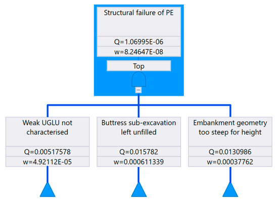 Fault trees are widely used and accepted qualitative and quantitative risk evaluation methods in dam engineering. The risk analysis method was initially developed to evaluate the reliability and complex systems [36]. Henrion [49] defines a fault tree as influence diagrams that exclusively express probabilistic relationships among system states without consideration of decisions and values. System relationships are expressed through deductive analysis, which postulates a system’s failure and attempts to deduce the mode and the failure sequence [50]. This paper focuses on the FTA method due to its prevalent use in tailings dam failure analysis during expert panel investigations. This is mainly due to FTA’s ability to focus more on the events leading to the failure and design dependability [47] compared to ETA, which describes all possible event combinations or factors.