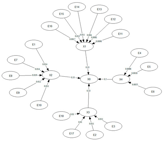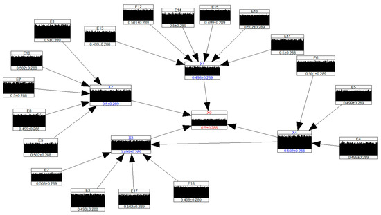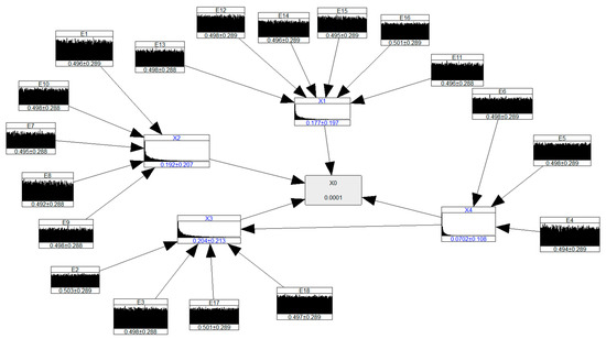 Conditionalising E16 and X4 by a magnitude of 10−4 reduced the occurrence of structural failure of the Perimeter Embankment significantly by 85% to a mean and standard deviation of 0.07 ± 0.11. Figure 16 shows the conditionalised BN.