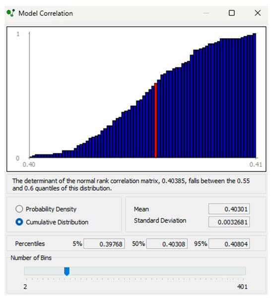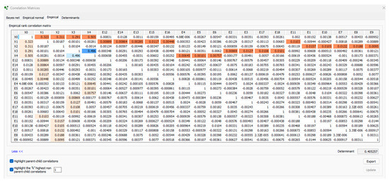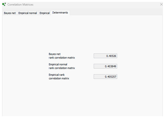 In uncertainty analysis, random variables are assigned a marginal distribution from a parametric distribution or user-defined distribution files. A DAG is specified to capture conditional relations, and parent–child probabilistic influences are represented as conditional rank correlations. Sequencing of conditional rank correlations implies that correlations are algebraically independent between −1 and 1, and contribute to the determinant of the BBN rank correlation matrix (DBBNR) [60]. The DBBNR can be represented as follows: