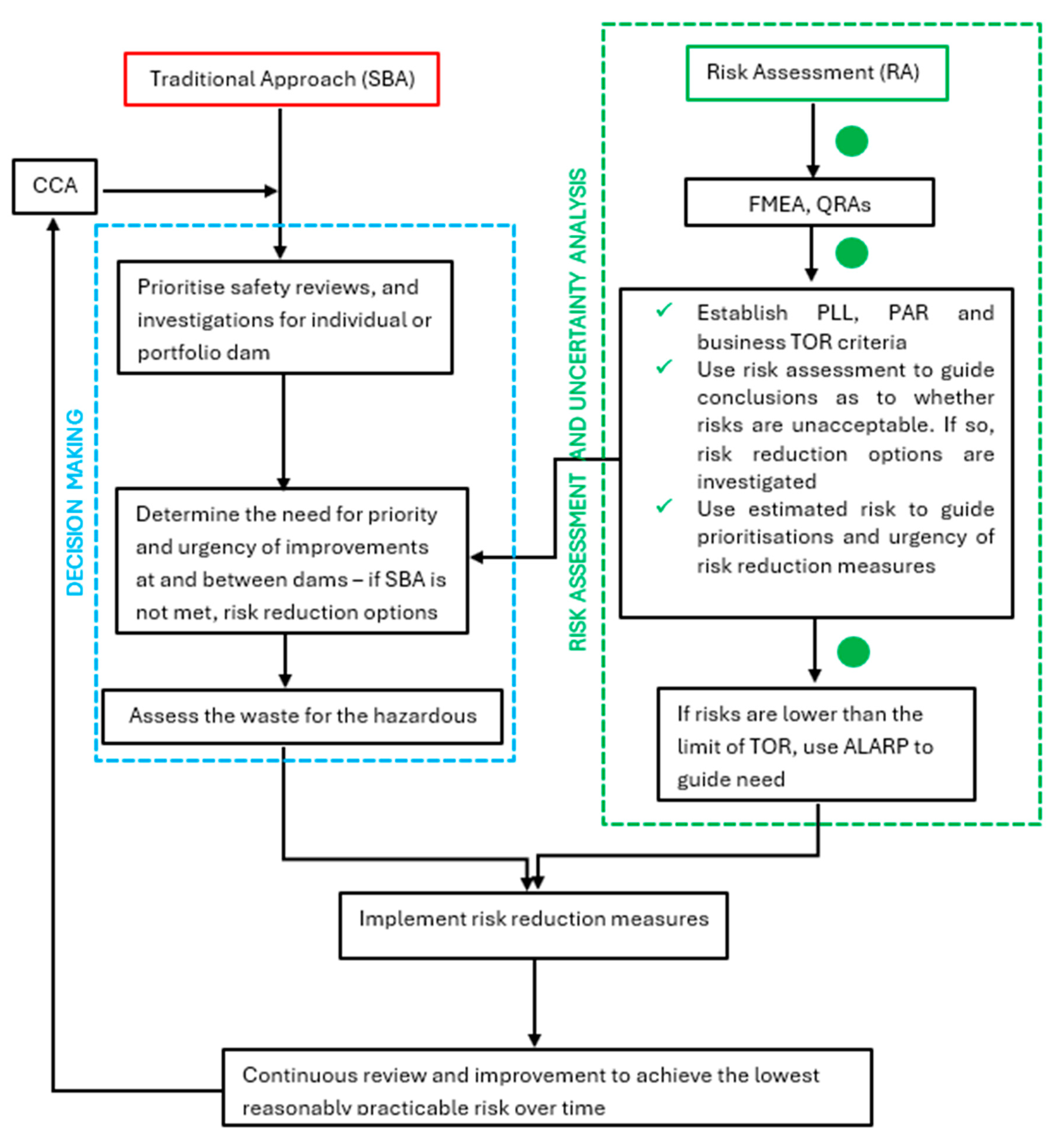 Figure 1. The adopted figure has been revised to reflect the critical components of risk assessment, uncertainty analysis, and decision-making in consequence-based analysis to enable risk-informed decision-making (RIDM). RIDM builds upon failure mode analysis, leveraging risk assessments to attain RRMs that meet ALARP. The consequence risk assessment should characterise the following to assist decision-making.