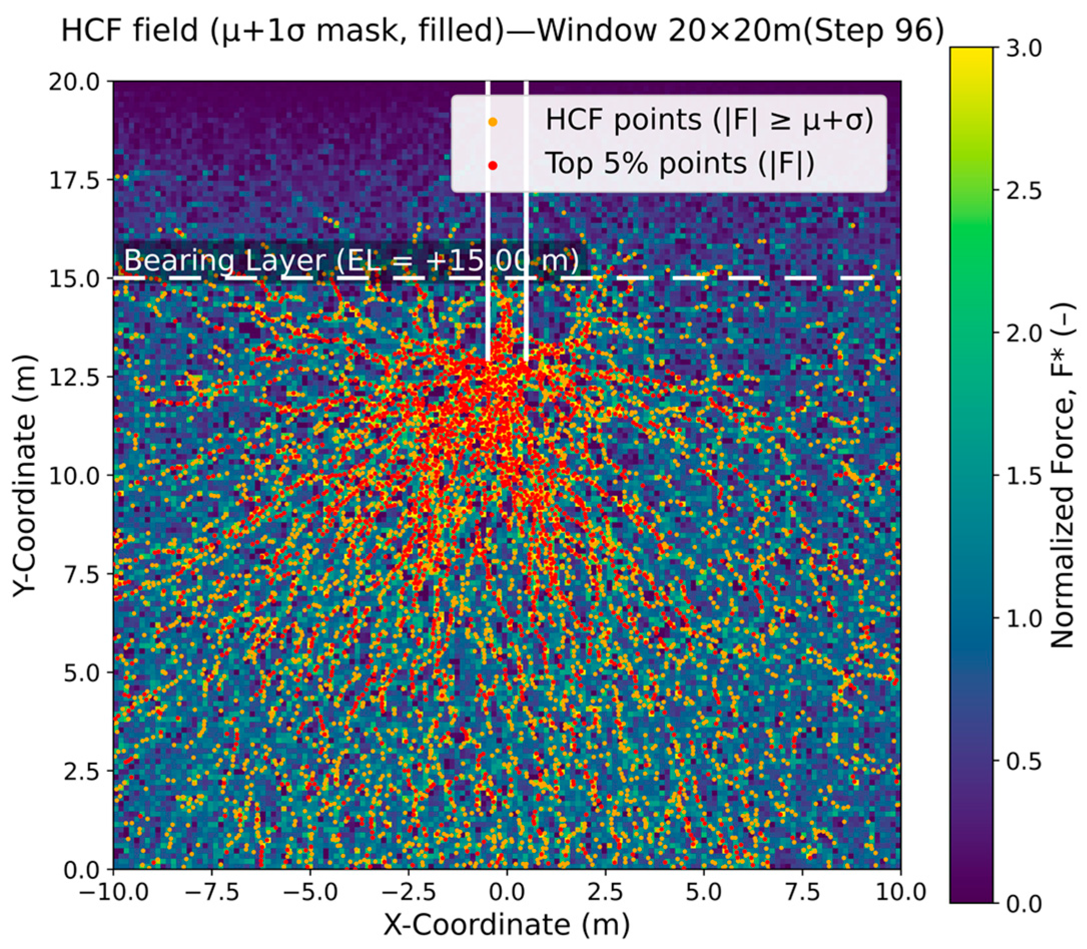 For HCF and density-index evaluation, common evaluation windows were used across all cases as follows: depth bands d = 0.20, 0.25, 0.30, and 0.50 m from the pile-tip level, and horizontal subdivision into ring (0.40–0.55 m) and core (∣x∣ ≤ 0.40 m).