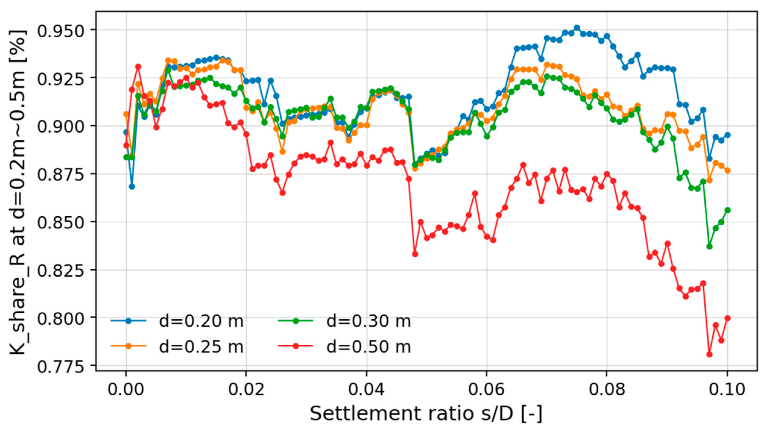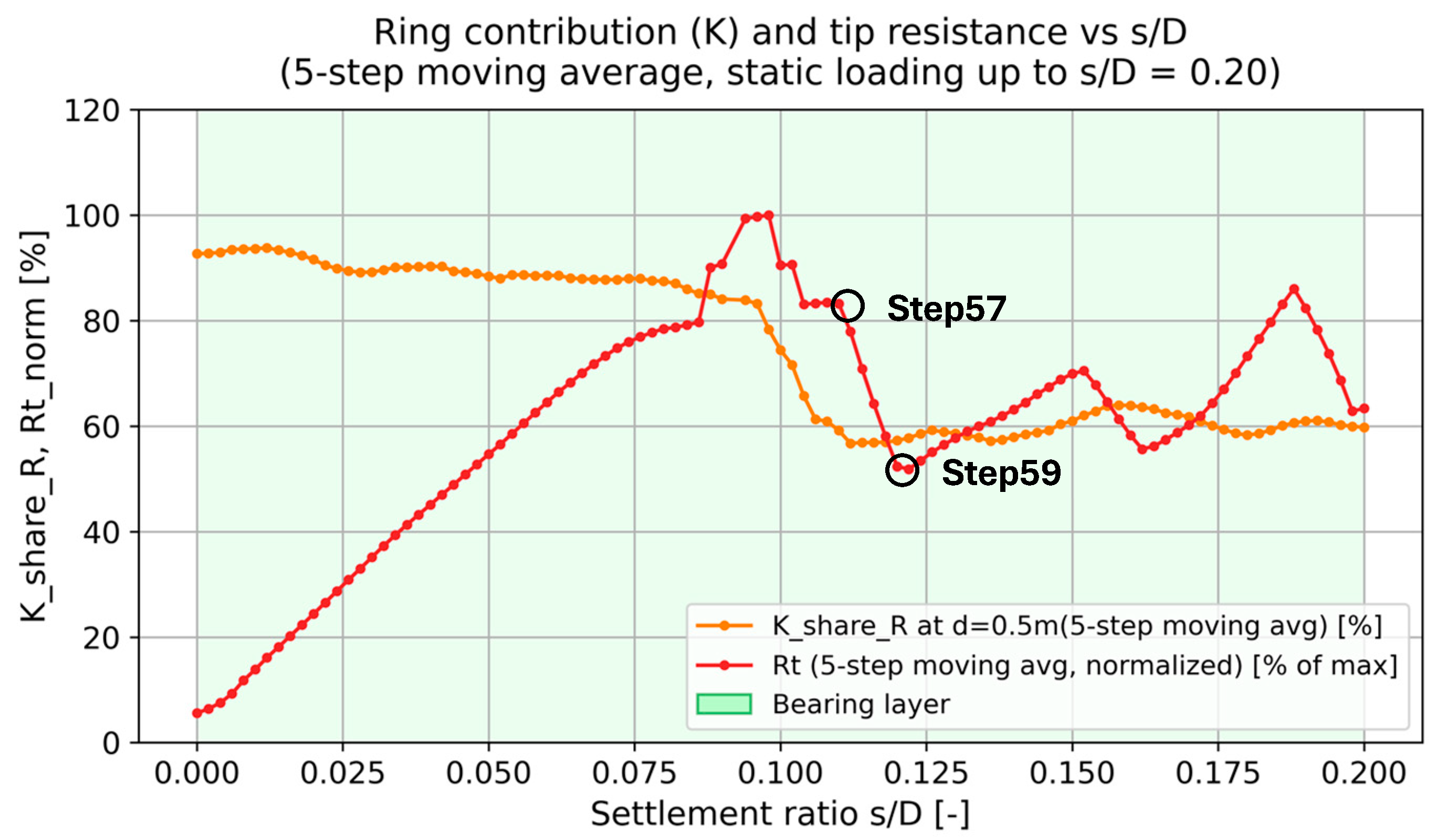 Although R_f remains high (62.4%), suggesting continued frictional dissipation, the tip resistance decreases to Rt = 22,359 kN. These results suggest that, while the plugging ratio is assumed to remain nearly constant throughout driving and static loading, both K_share,R and Rp/Rt decrease during static loading, indicating a reduction in that the burden carried by the ring diminishes as struts fail, even though plugging is assumed to remain unchanged.